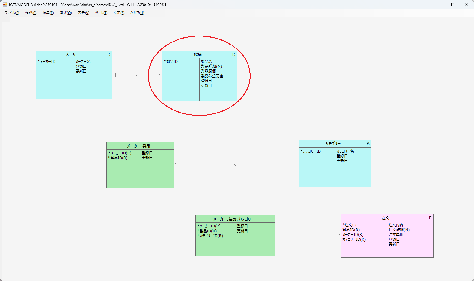 赤丸枠で示されているのが、「製品エンティティ」になります。