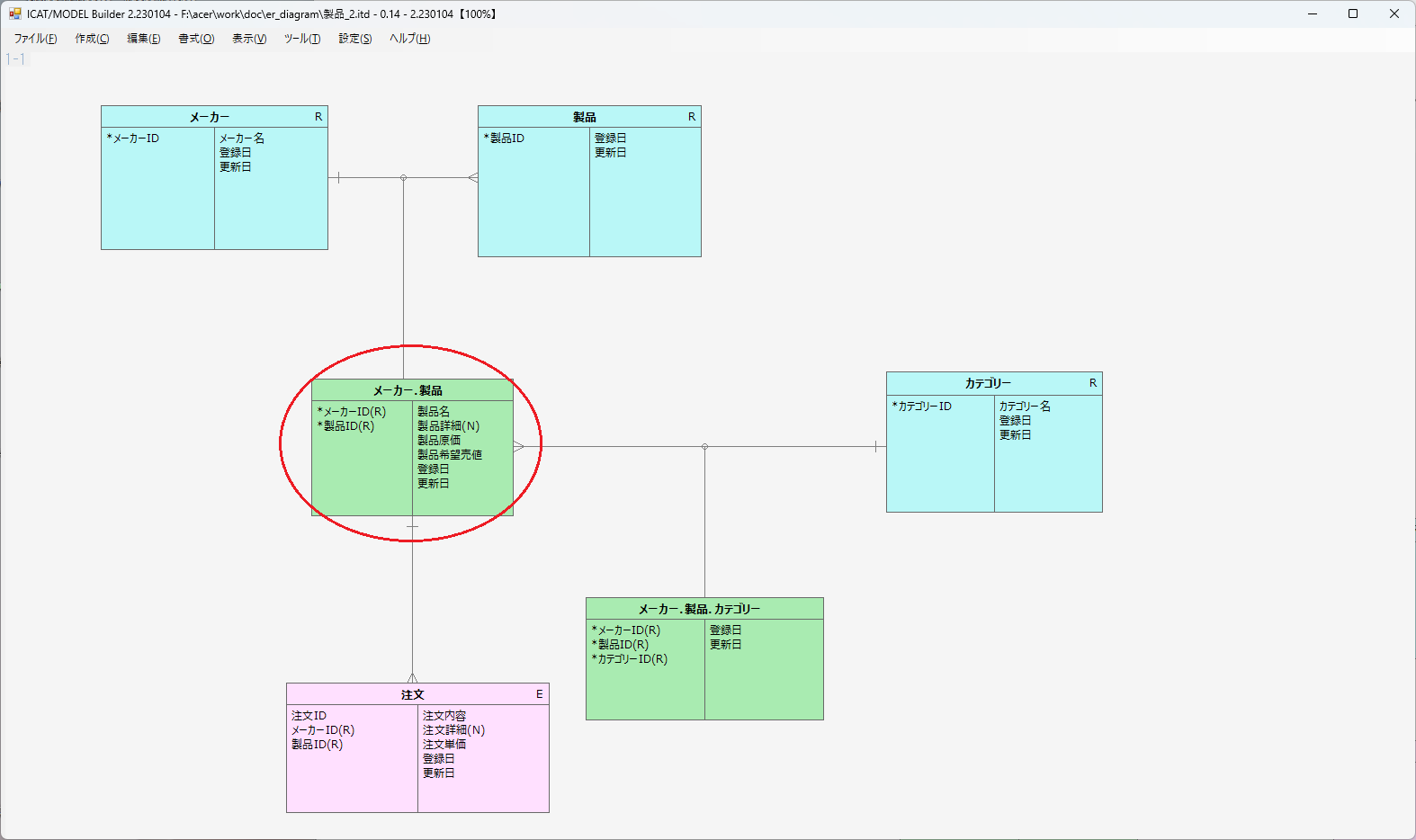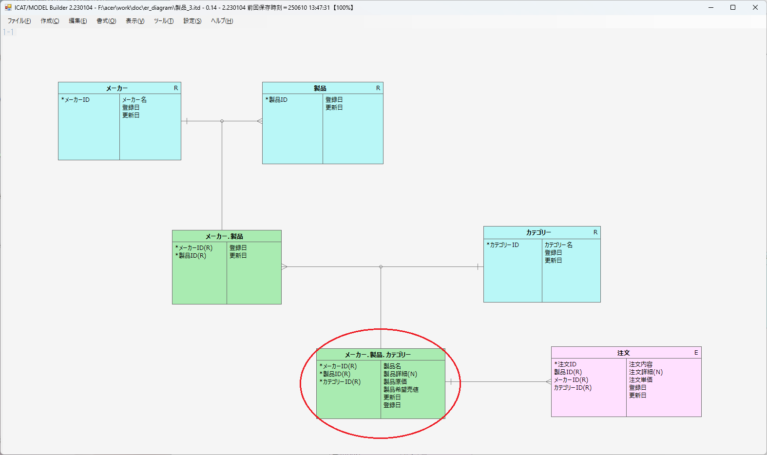 実は、【T字形ER手法】で導いた「メーカー・製品・カテゴリー 対照表」が、サンプルER図で