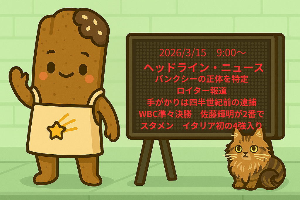 2026/03/15 09:00:03 - INFO - 朝日新聞 新着ニュース 2026/03/15 09:00:03 - INFO - ------------------------------------------------------ 2026/03/15 09:00:11 - INFO - 1:WBCにも政治の影 「雑音」の中、米国で試合に臨むベネズエラ代表 2026/03/15 09:00:29 - INFO - 2:トランプ氏、日本など列挙し「ホルムズ海峡に船舶を送ってほしい」 2026/03/15 09:00:46 - INFO - 3:トランプ氏、カーグ島爆撃を発表 イラン経済生命線、戦闘激化の危険 2026/03/15 09:01:04 - INFO - 4:バンクシーの正体を特定 ロイター報道 手がかりは四半世紀前の逮捕 2026/03/15 09:01:22 - INFO - 5:伸びる20代と伸び悩む50代 人手不足が映し出す「賃金上昇」格差 2026/03/15 09:01:39 - INFO - 6:パンプスは冬の時代? 路線は脱「我慢」、ソールもヒールも進化中 2026/03/15 09:01:57 - INFO - 7:女性初の知事になるも「男女関係ない」 女性幹部登用には難しさも 2026/03/15 09:02:14 - INFO - 8:福島第一原発 15年後の謎 2026/03/15 09:10:03 - INFO - Yahoo!! Japan 新着ニュース 2026/03/15 09:10:03 - INFO - --------------------------- 2026/03/15 09:10:11 - INFO - 1:侍J ベネズエラ戦のスタメン発表 2026/03/15 09:10:20 - INFO - 2:イラン UAE3港を攻撃目標と警告 2026/03/15 09:10:30 - INFO - 3:中国衛星 日本上空通過10分に1回 2026/03/15 09:10:40 - INFO - 4:新宿で緊縛強盗が発生 男2人逃走 2026/03/15 09:10:49 - INFO - 5:小4いじめ被害 学校が不適切対応 2026/03/15 09:10:59 - INFO - 6:芸術家バンクシーの正体特定 報道 2026/03/15 09:11:08 - INFO - 7:大谷フリー打撃 相手選手くぎ付け 2026/03/15 09:11:17 - INFO - 8:快挙 イタリアがWBC初の4強入り 2026/03/15 09:20:03 - INFO - 日本経済新聞 新着ニュース 2026/03/15 09:20:03 - INFO - ------------------------------------------------------ 2026/03/15 09:20:11 - INFO - 1:福岡・VIVANT ジョージア料理、ナス香ばしくワインの風味爽やか 2026/03/15 09:20:30 - INFO - 2:15日の有力馬 金鯱賞など競馬予想 2026/03/15 09:20:40 - INFO - 3:WBC準々決勝、佐藤輝明が2番でスタメン イタリアが初の4強入り 2026/03/15 09:20:58 - INFO - 4:自衛隊はホルムズ海峡に出動可能か 「米が国際法違反」前提なら厳しく 2026/03/15 09:21:16 - INFO - 5:イラン情勢、金融ショックに備えはあるか ファンド融資もリスク要因 2026/03/15 09:21:34 - INFO - 6:チェキ復活やクローン工場生んだ危機 富士フイルムの変革まとめ読み 2026/03/15 09:21:51 - INFO - 7:東日本大震災から15年 農家は廃業・住民戻らない村、それでも前向く 2026/03/15 09:22:10 - INFO - 8:レアアース大国への条件 元素ゆるキャラ図鑑で基礎から考える 2026/03/15 09:30:03 - INFO - 読売新聞 新着ニュース 2026/03/15 09:30:03 - INFO - ------------------------------------------------------ 2026/03/15 09:30:12 - INFO - 1:WBC準々決勝・ベネズエラ戦、佐藤輝明が2番・ライトでスタメン出場…近藤健介はベンチスタート 2026/03/15 09:30:37 - INFO - 2:大谷翔平、フリー打撃で柵越え13本…侍Jきょうベネズエラと準々決勝 2026/03/15 09:30:55 - INFO - 3:「H3」6号機が50秒間のエンジン燃焼試験…ブースターなし、打ち上げ費用はH2Aの半額目指す 2026/03/15 09:31:20 - INFO - 4:加藤茶さん、妻の減塩料理「最初はまずくて」…人工透析を回避できていることを明かす 2026/03/15 09:31:42 - INFO - 5:ベネズエラ先発左腕は大谷翔平を苦しめた難敵…井端監督「狙い球を絞って」 2026/03/15 09:32:01 - INFO - 6:ミラノパラきょうの見どころ…アルペン男子と距離スキー、メダル死守なるか…閉会式も 2026/03/15 09:32:23 - INFO - 7:WBC、イタリアが初の4強…日本がベネズエラ戦で勝てば準決勝で対戦 2026/03/15 09:32:41 - INFO - 8:「文学は一寸先が闇であるべきだ。登山にも通じる」…第77回読売文学賞、高橋睦郎さんの選評 2026/03/15 09:40:03 - INFO - 毎日新聞 新着ニュース 2026/03/15 09:40:03 - INFO - ------------------------------------------------------ 2026/03/15 09:40:12 - INFO - 1:小4いじめ被害、学校が不適切対応 保護者に連絡せず深刻化か 千葉 2026/03/15 09:40:30 - INFO - 2:埼玉・長瀞町長を公選法違反容疑で書類送検 上限超の運動員に報酬か 2026/03/15 09:40:48 - INFO - 3:イラン情勢を左右する「禁断の島」 石油インフラ集中のカーグ島とは 2026/03/15 09:41:05 - INFO - 4:歩兵は「生きた盾」 上官の判断に疑問、ウクライナ脱走兵が語る現実 2026/03/15 09:41:23 - INFO - 5:荻原博子氏「高市政権の物価高、少子化対策って効果ある?」 2026/03/15 09:41:39 - INFO - 6:ユルゲン・ハーバーマスさん死去 96歳 現代ドイツ代表する哲学者 2026/03/15 09:41:56 - INFO - 7:「友人と行く」カンボジアで行方不明 福岡だけで10人 無事祈る母 2026/03/15 09:42:14 - INFO - 8:「国宝」ロケ地になった岡山の個人宅 聖地巡礼者相次ぎ「光栄」 2026/03/15 09:50:03 - INFO - 毎日新聞 RSS情報 2026/03/15 09:50:03 - INFO - ------------------------------------------------------ 2026/03/15 09:50:11 - INFO - 1:奇跡の一本松の「子ども」里帰り 高田松原で育つ復興のシンボル 2026/03/15 09:50:28 - INFO - 2:鈴木誠也「少し日本の野球も変わってきた」 準々決勝を前に意気込み 2026/03/15 09:50:45 - INFO - 3:いじめ「重大事態」認定せず…第三者委が学校側の対応を批判 和歌山 2026/03/15 09:51:03 - INFO - 4:誰もが知ってる「ドッジボール」 魅力は? 日本代表、アジアで優勝 2026/03/15 09:51:21 - INFO - 5:アラフィフから9カ国語 中