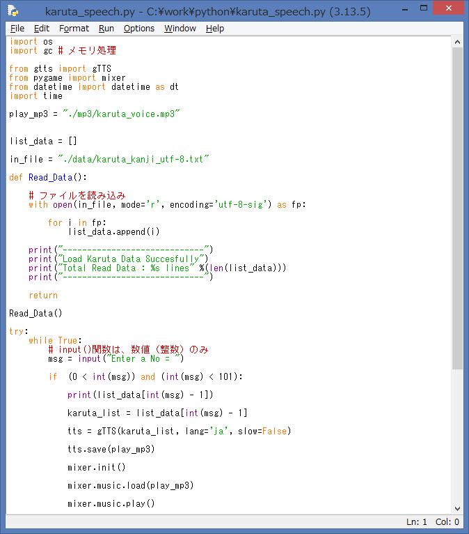 ソースを起動して、エラーが無ければ、IDLE Shell には、「百人一首」の番号入力を