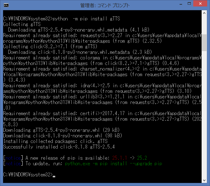 下記のコマンドで、gTTSライブラリをインストールしてみます。