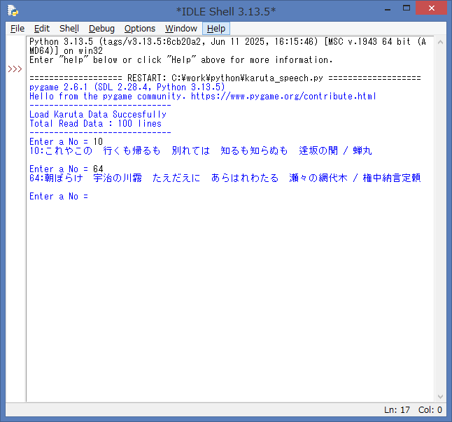 ソースを起動して、エラーが無ければ、IDLE Shell には、「百人一首」の番号入力を