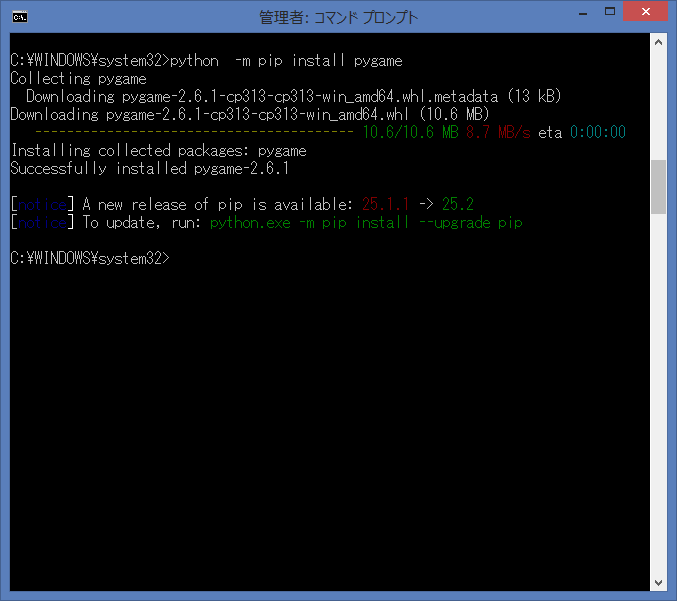 下記のコマンドで、pygameライブラリをインストールしてみます。