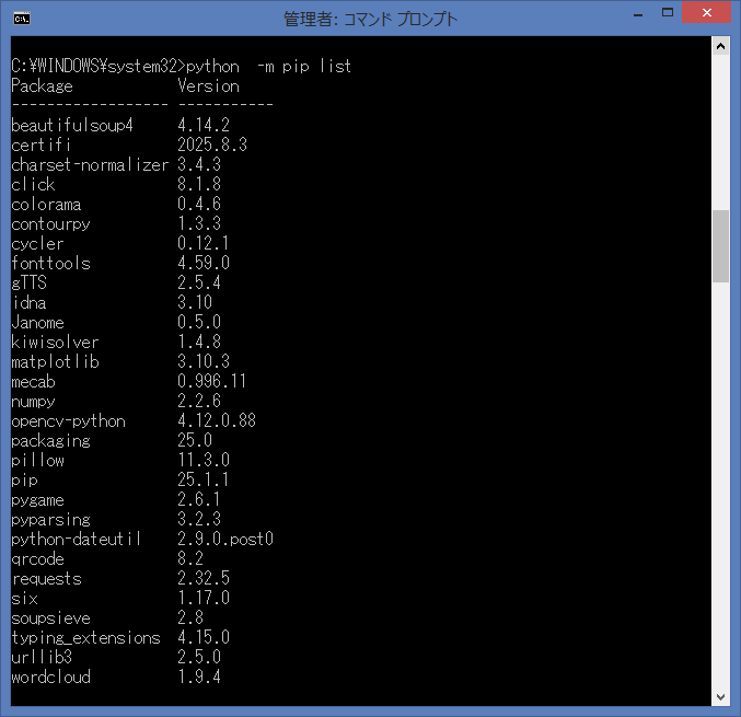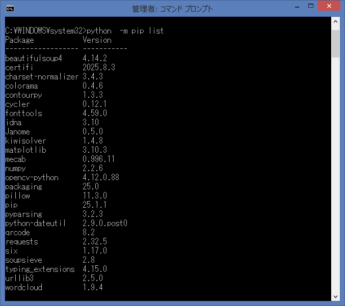 インストール済みのライブラリを、下記のコマンドで確認してみましょう。