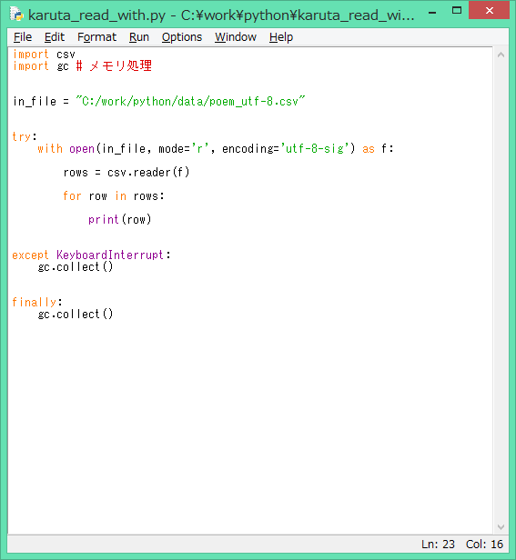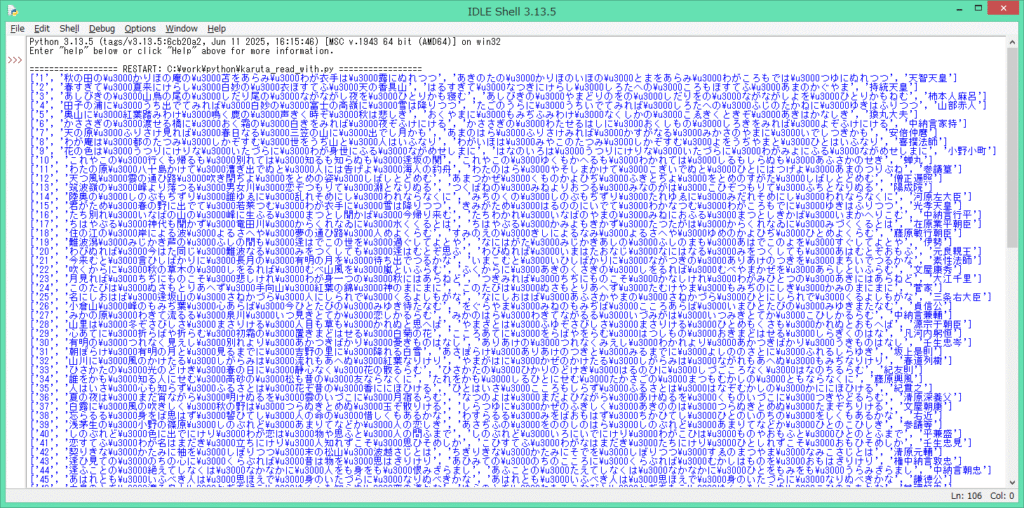 処理の説明をしますと、「百人一首」CSVファイルencoding=’utf-8-sig読み込み