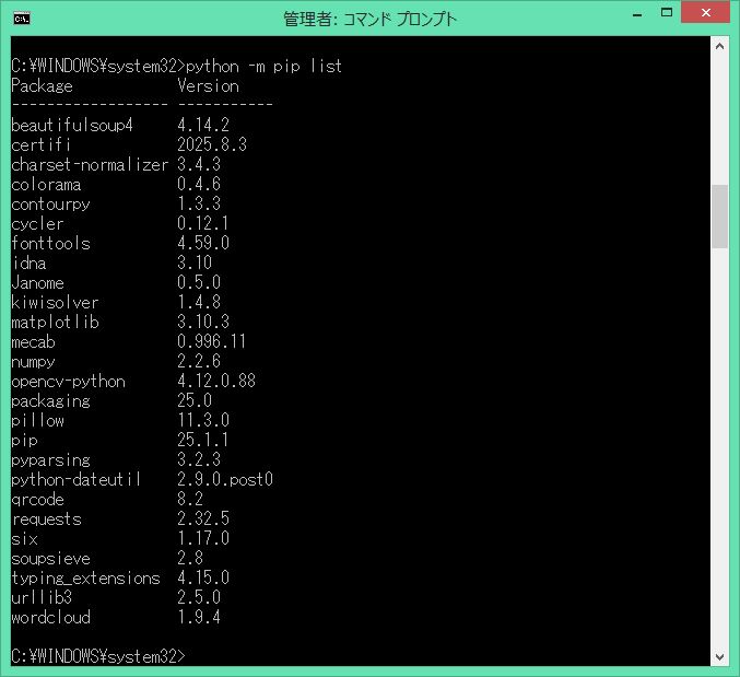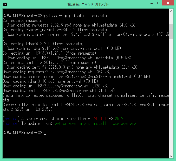 では、下記のコマンドで、Requestsライブラリをインストールしてみます。