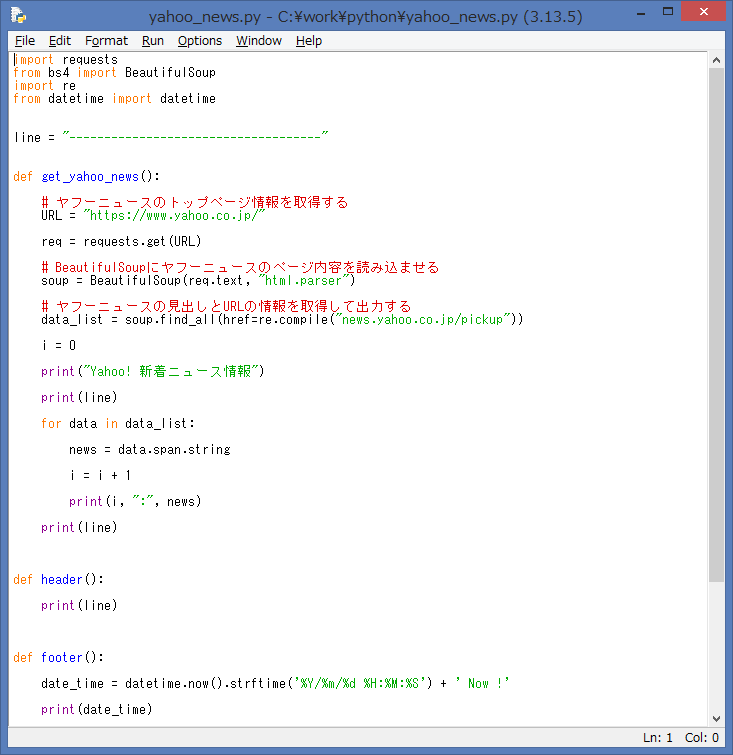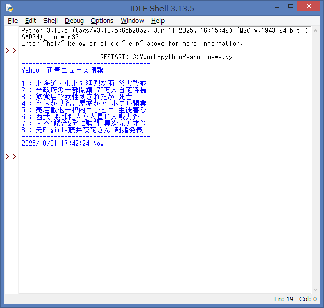 ソースを起動して、エラーが無ければ、IDLE Shell には、Yahoo News より