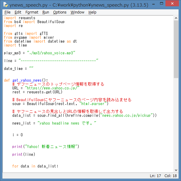 - news_end = date_time + “現在の yahoo headline news でした。”:音声データの終了用に、文字列を設定しています。