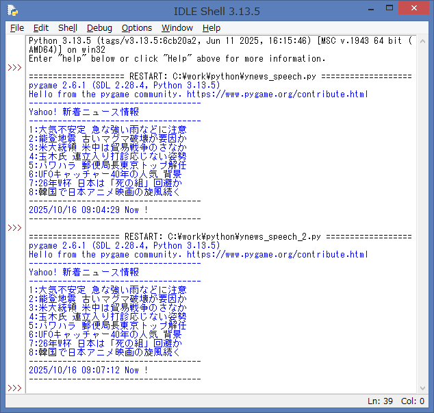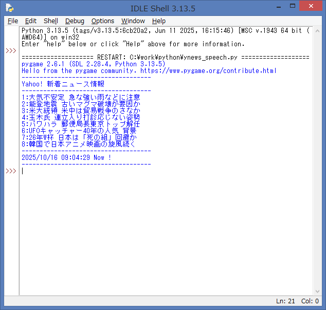 ソースを起動して、エラーが無ければ、IDLE Shell には、Yahoo! ニュース より
