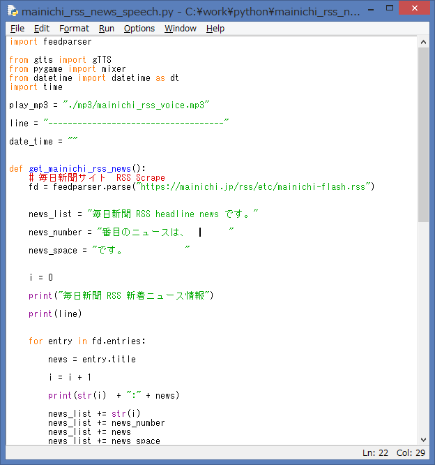 - news_end = date_time + “現在の毎日新聞 RSS headline news でした。”:音声データの終了用に、文字列を設定しています。