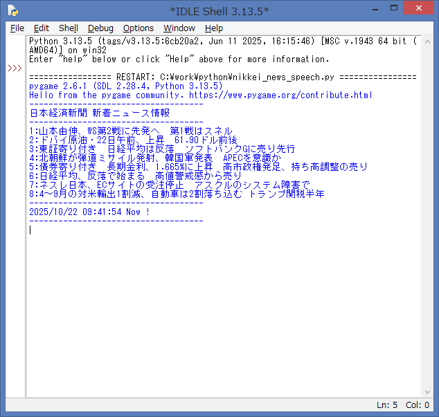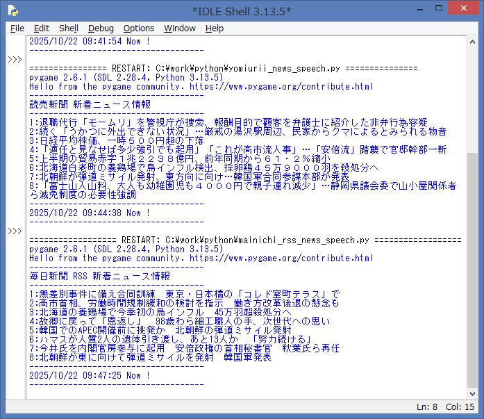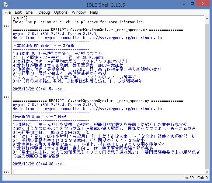 ソースを起動して、エラーが無ければ、IDLE Shell には、読売新聞 Webサイト より