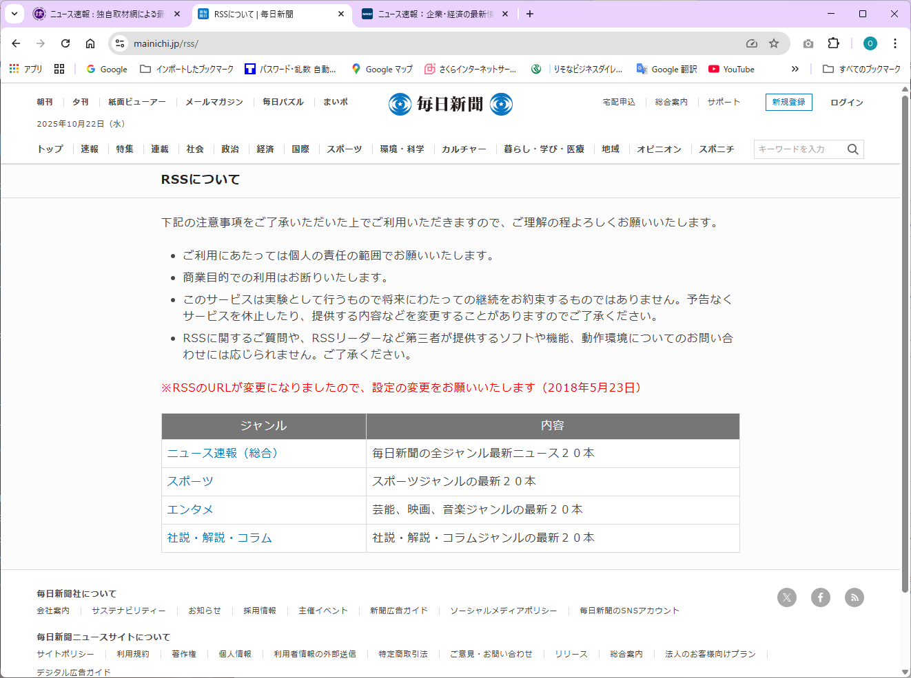 毎日新聞 Webサイト の RSSフィード のWebサイトを見てみましょう。