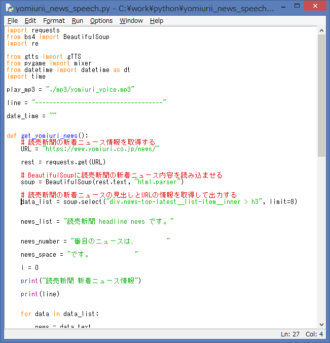 - news_end = date_time + “現在の読売新聞 headline news でした。”:音声データの終了用に、文字列を設定しています。