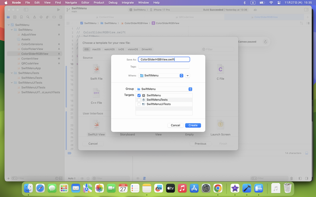 Create ボタンを押して、ColorSliderHSBView.swift を作成します。