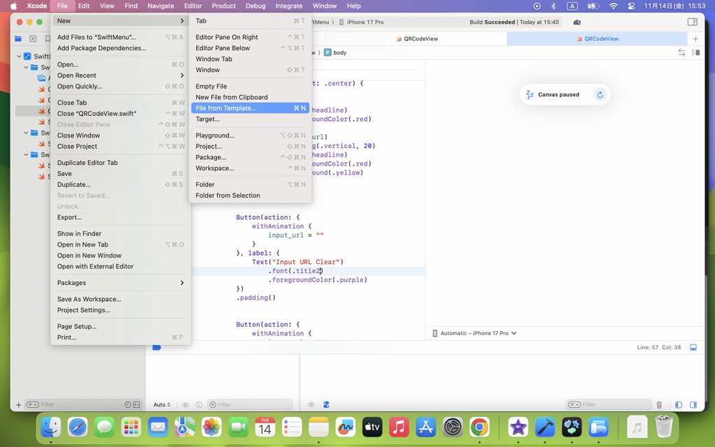 Xcode の上部タブメニューより、File → New → File from Template を選択します。