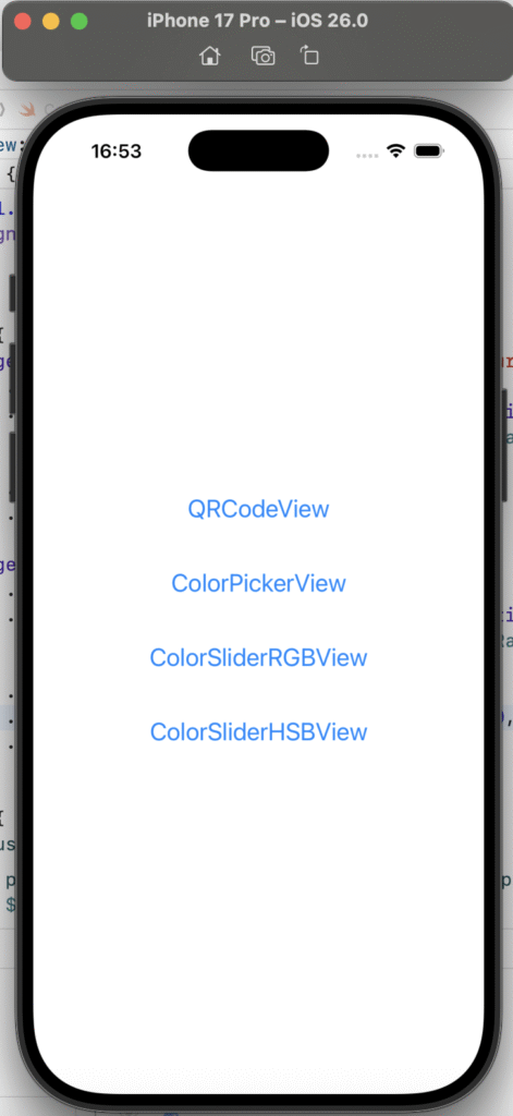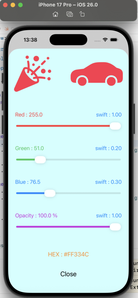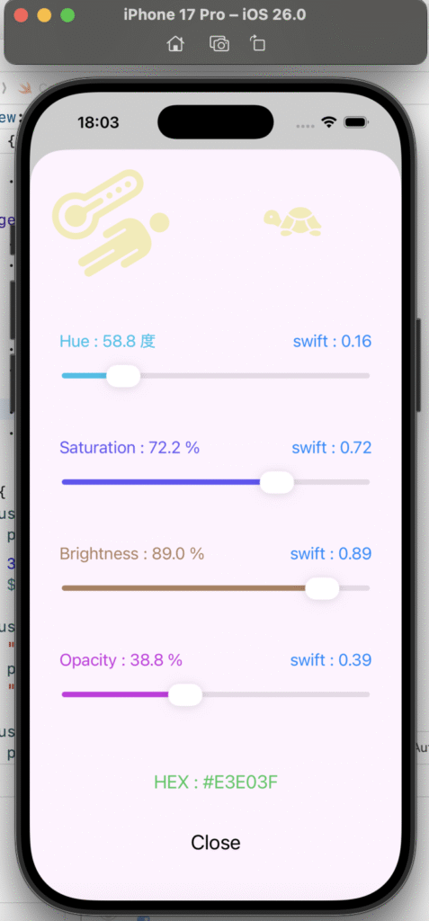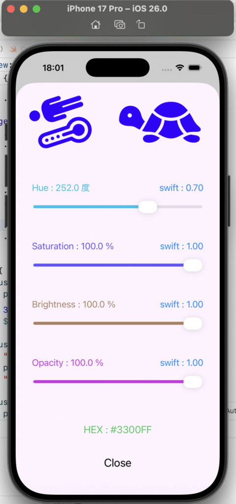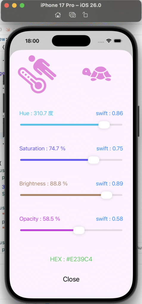 - Text(“HEX : #\(adjust_color.hex)”):ColorExtensions で拡張した16進数(HEX)表現を呼び出して、Textで表示しています。