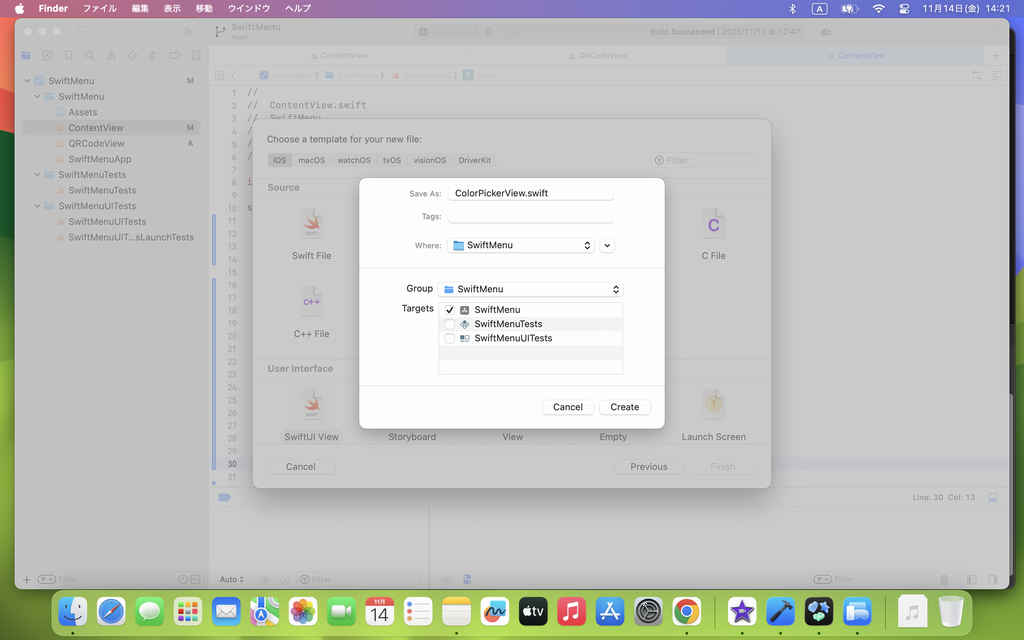 Create ボタンを押して、ColorPickerView.swift を作成します。