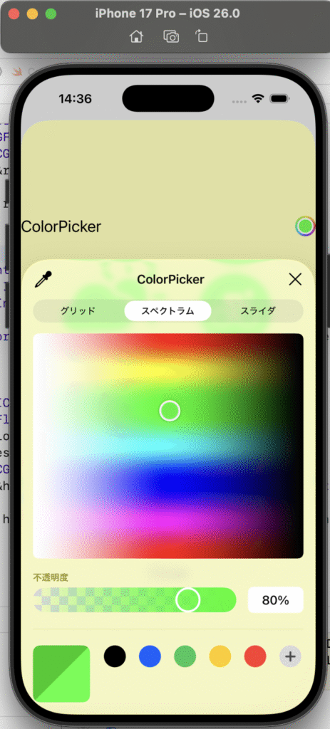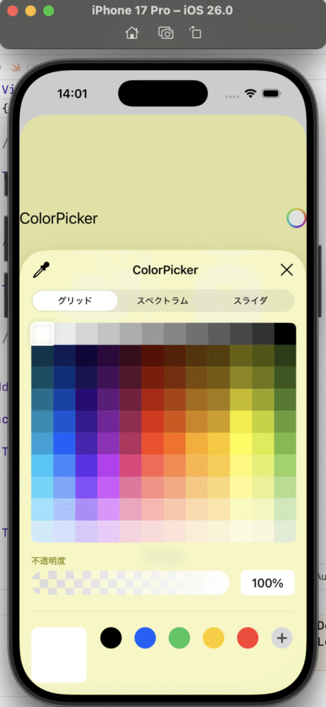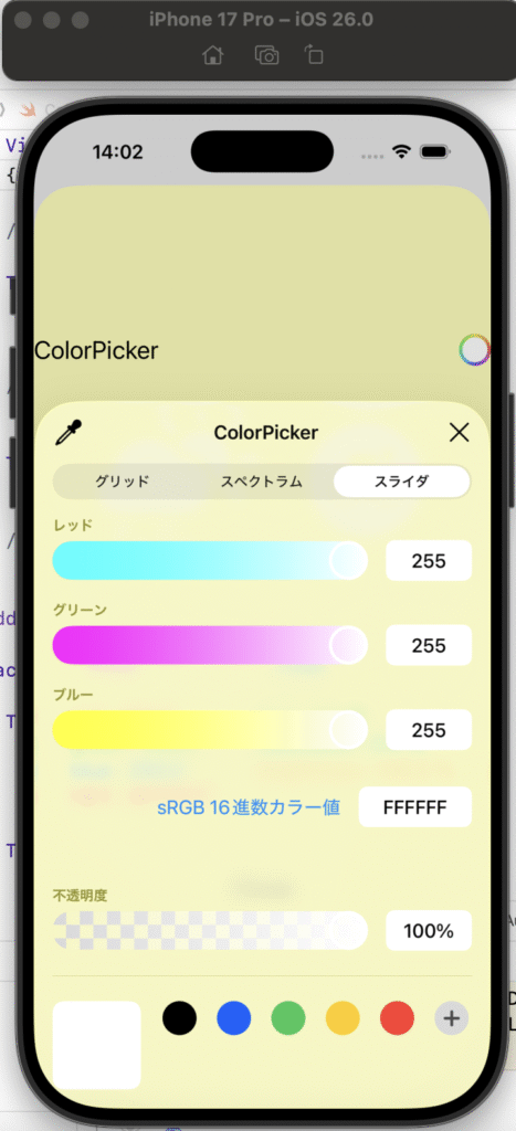 では、ColorPickerViewボタンを押してみます(タップします)。