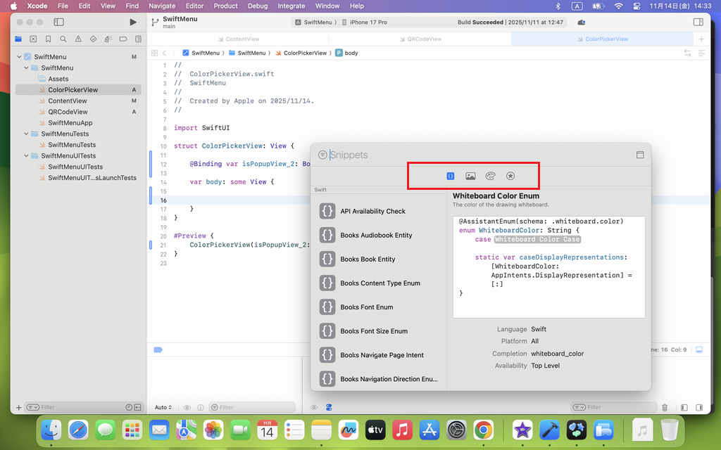 先程、作成した ColorPickerView を ContentView のメニューに追加します。