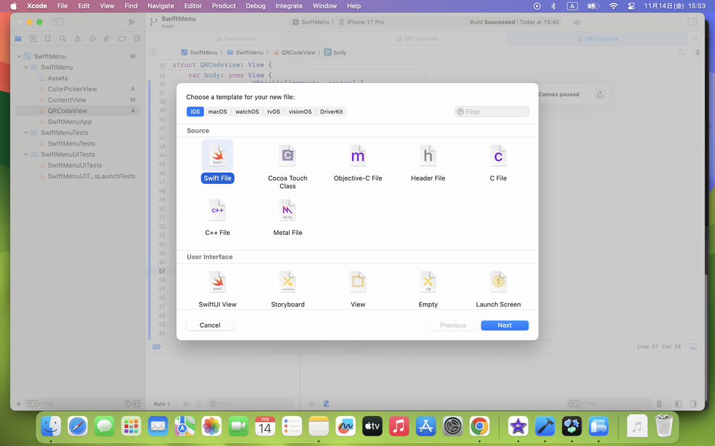 Xcode の上部タブメニューより、File → New → File from Template を選択します。
