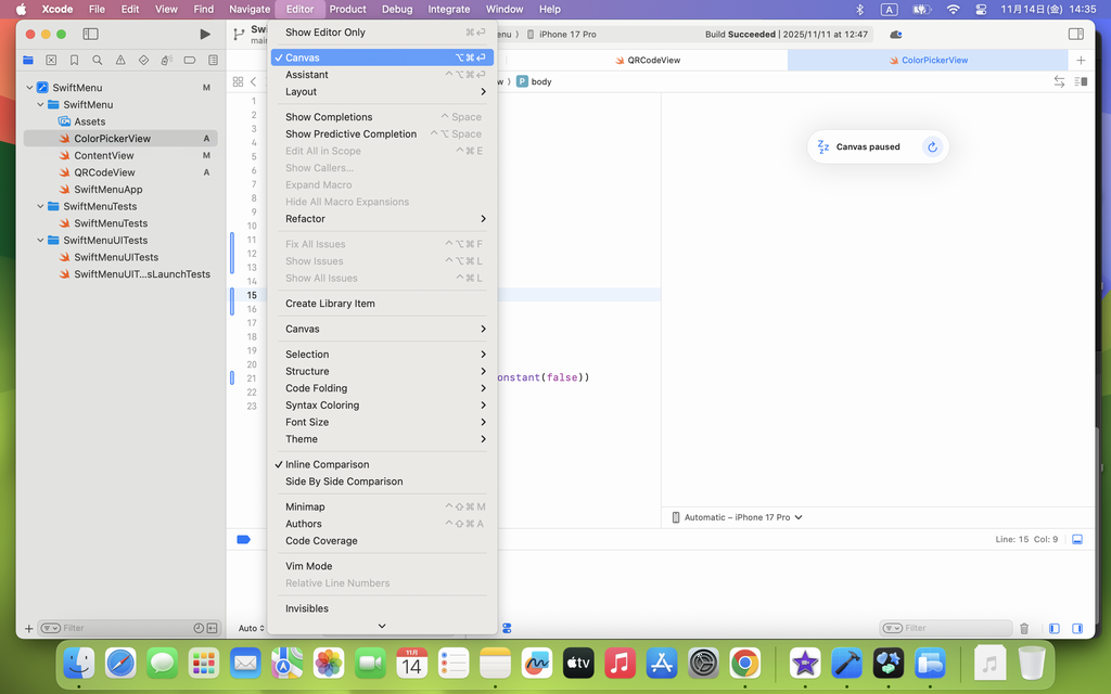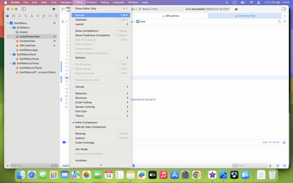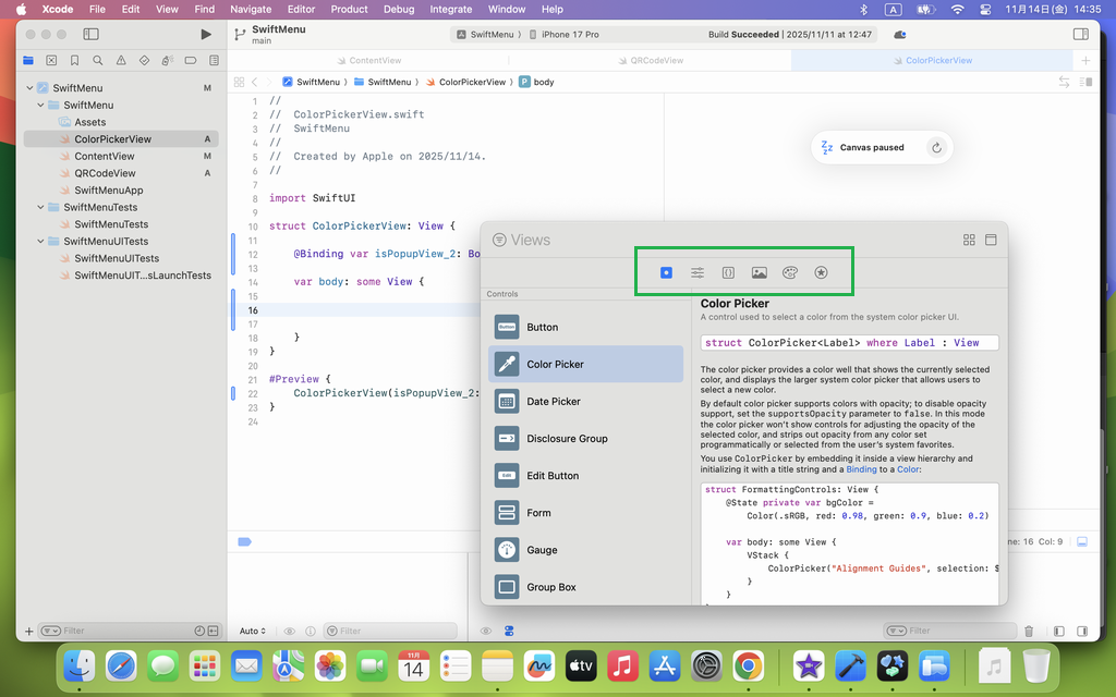 先程、作成した ColorPickerView を ContentView のメニューに追加します。