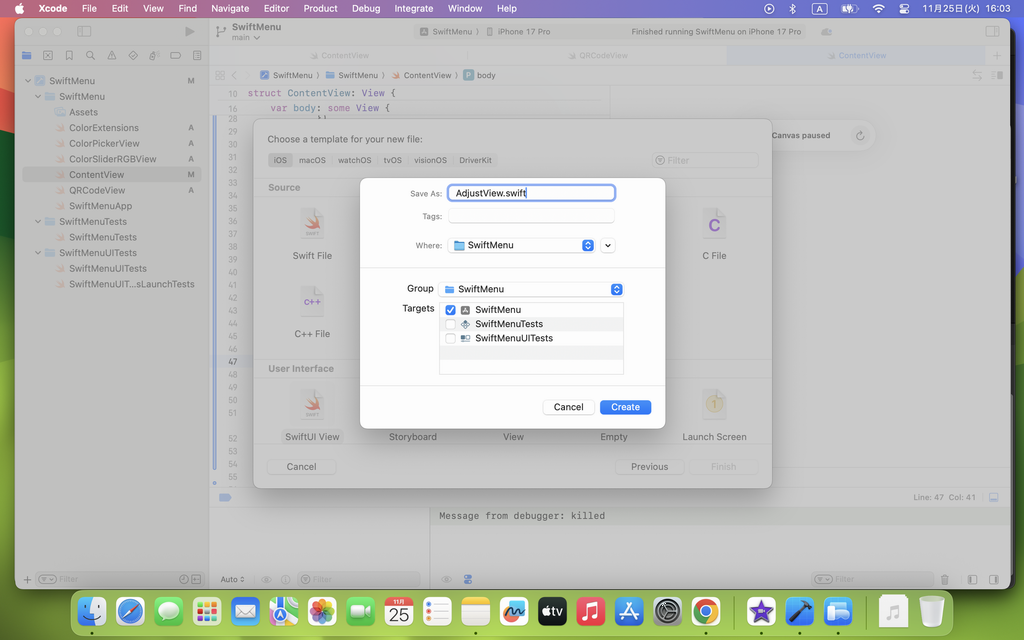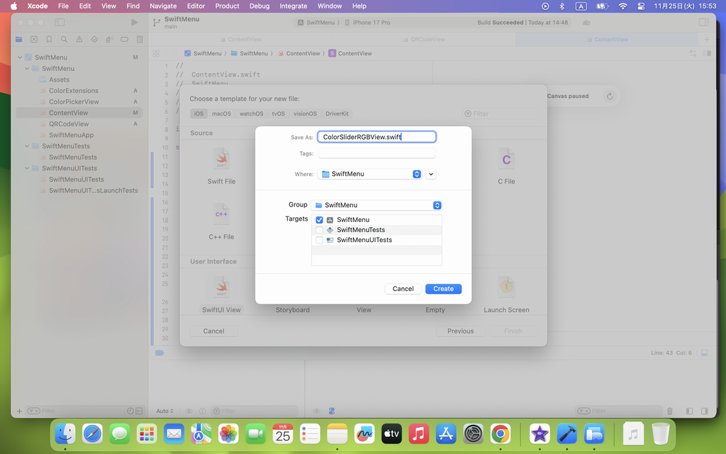 Create ボタンを押して、ColorSliderRGBView.swift を作成します。