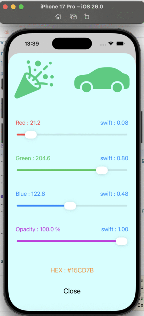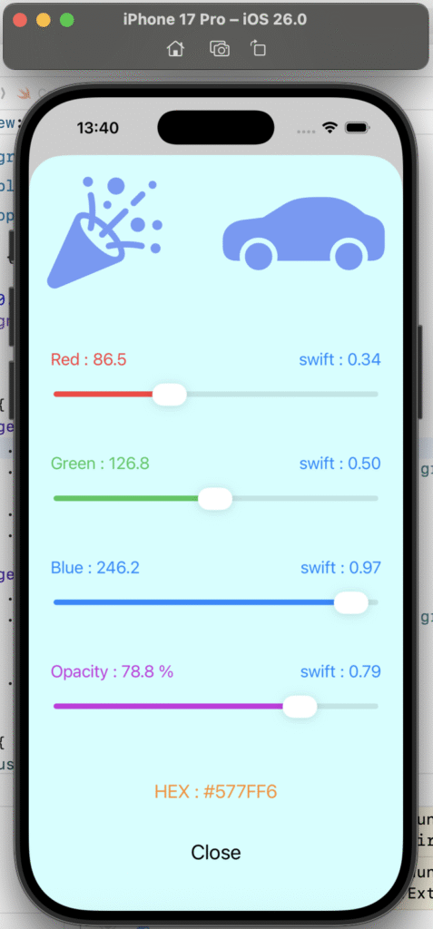 - Text(“swift : \(parameter, specifier: “%.2f“)”):Slider の右上に、ColorSliderRGBView で設定した parameter を取得して、swift:0.20 のように値を小数点第二位まで表示しています。