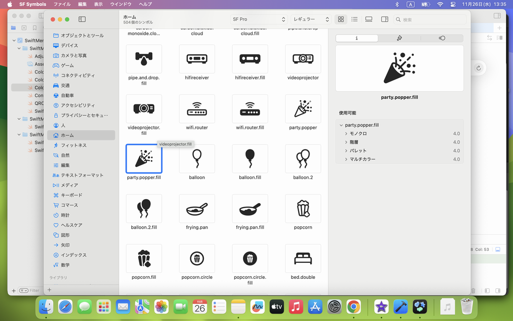 こちらは、SF Symbols で、party.popper.fill のアイコンを表示した画面です。