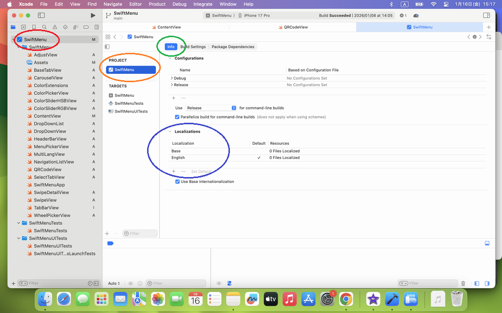 すると、info タブ(青枠)の下位に、Localizations 情報(青枠)が見えると思います。