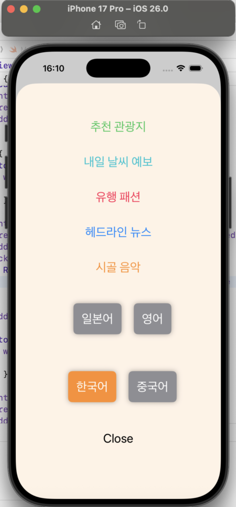 • .fill(selectedLang ==ko? Color.orange : Color.gray)selectedLang が “ko” の場合は、ボタンの色をオレンジ色に設定し、それ以外の場合は、グレー色に設定しています。