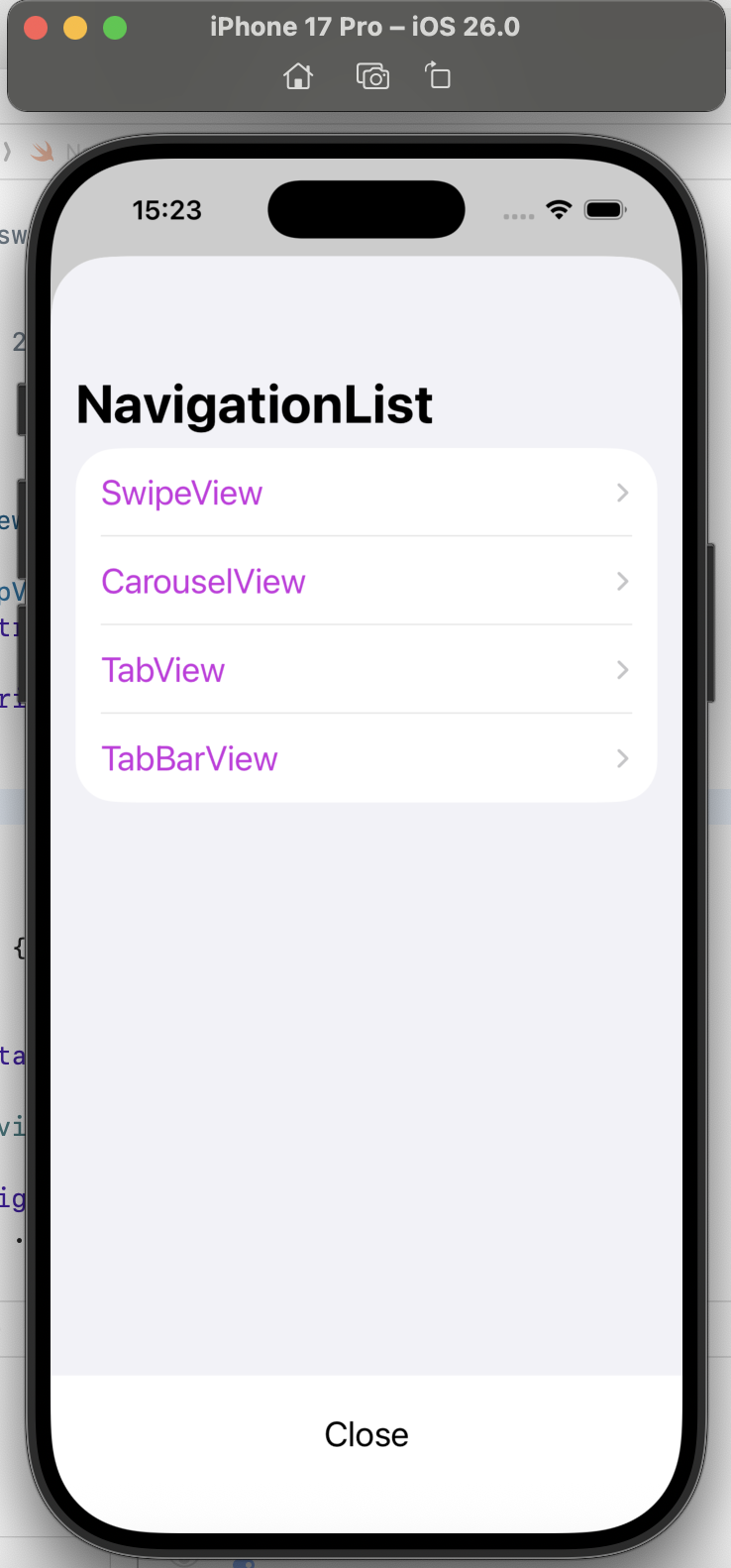 次に、NavigationList の上段の SwipeView を押してみます(タップします)。