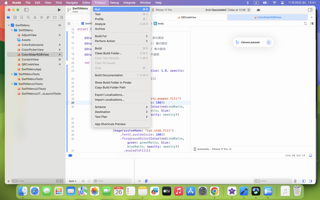 Xcode の上部タブメニューより、Product → Run を選択するか、command + R を