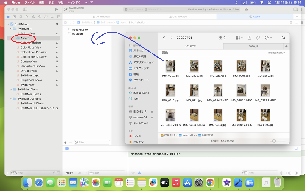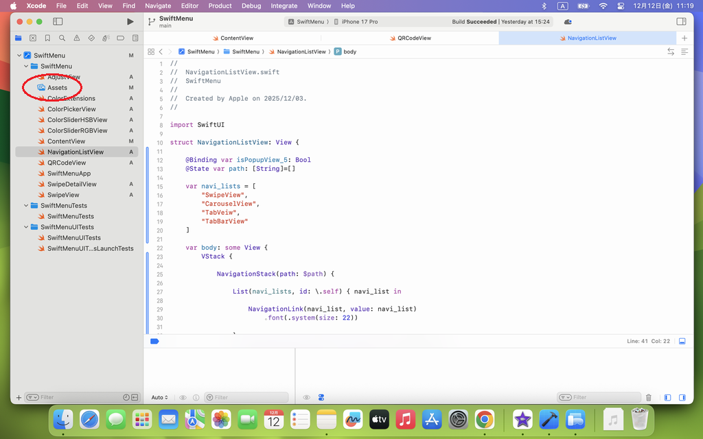 - Assets:Xcodeで、画像や動画、音声等のコンテンツファイルを格納・管理するフォルダで、利用方法を習得します。