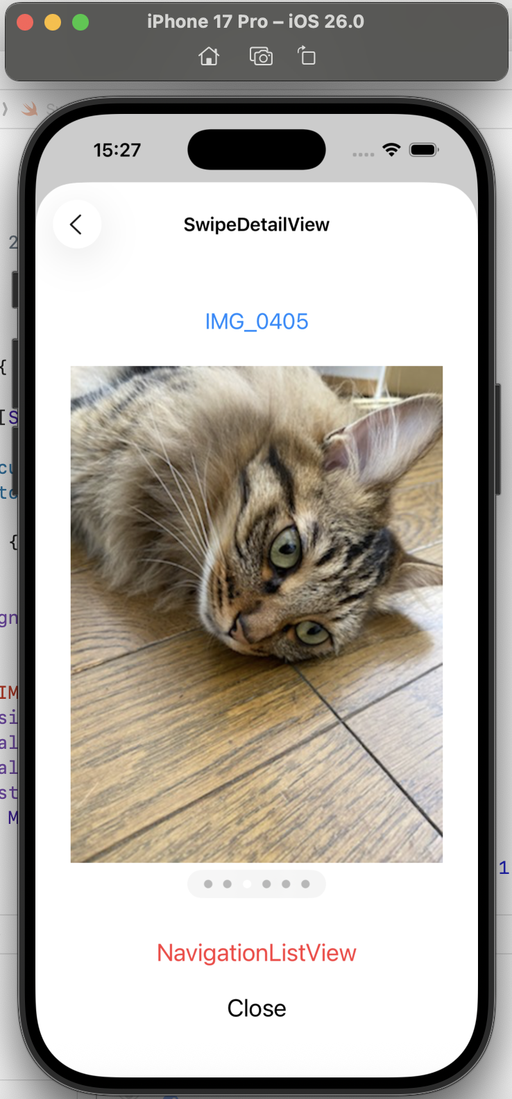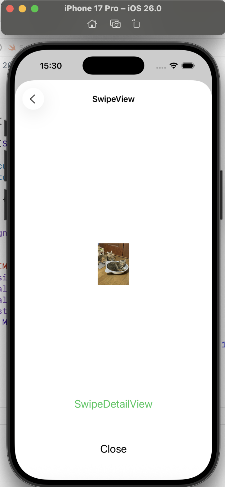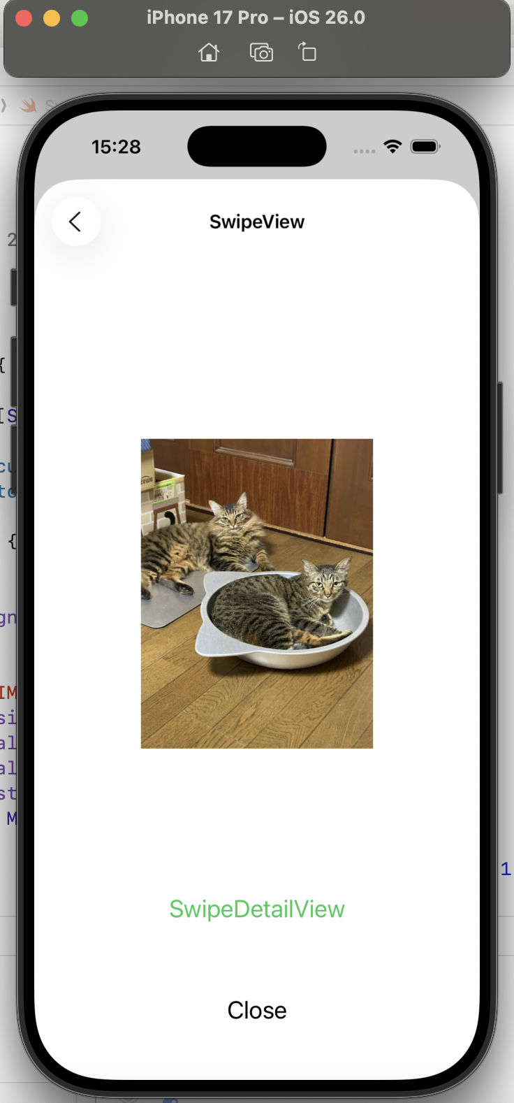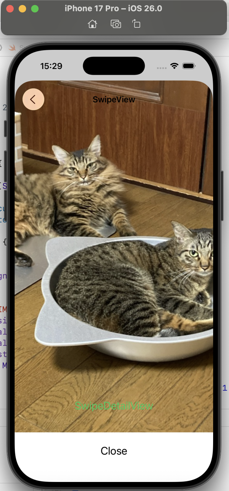 上記のように、SwipeDetailView へ画面推移した事が確認出来ると思います。