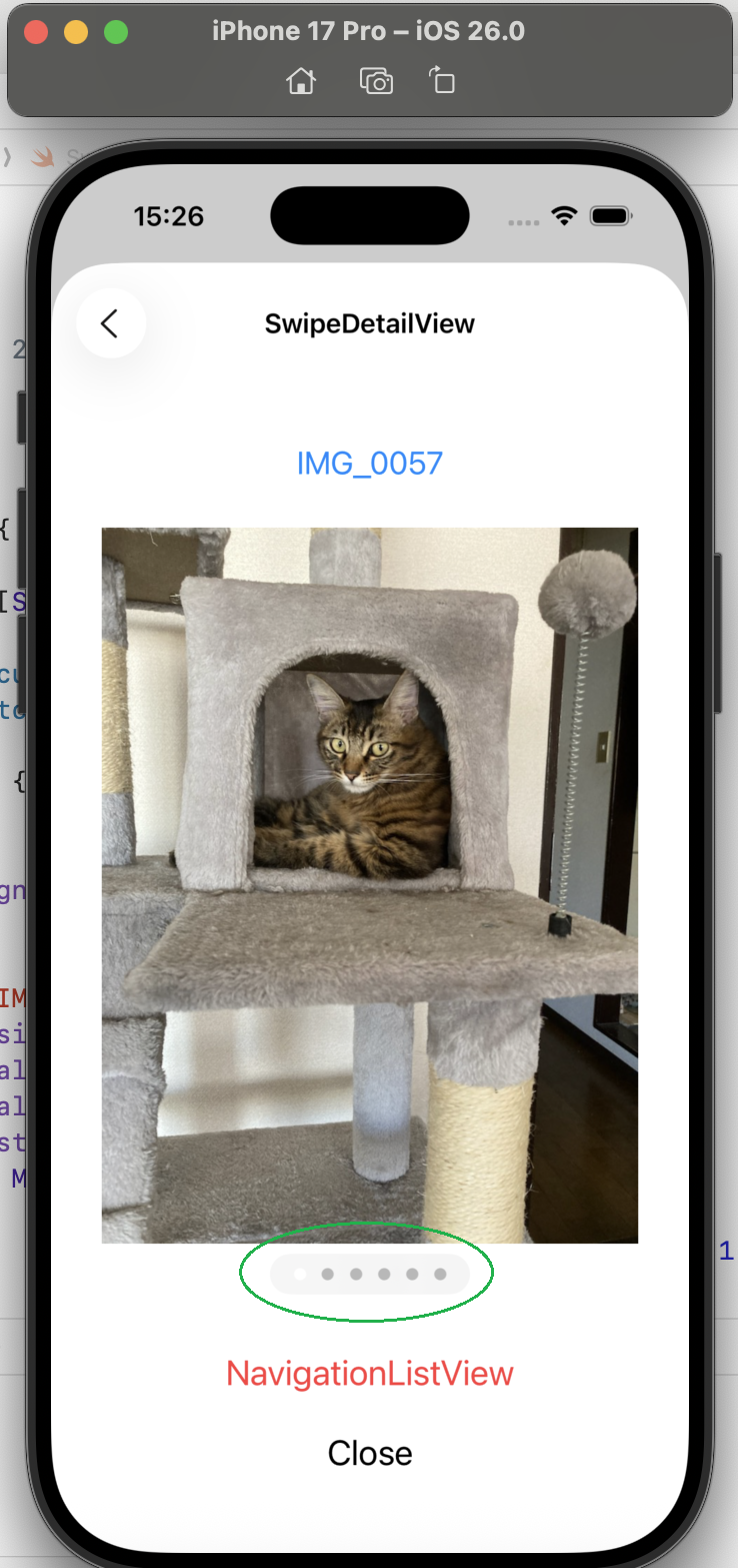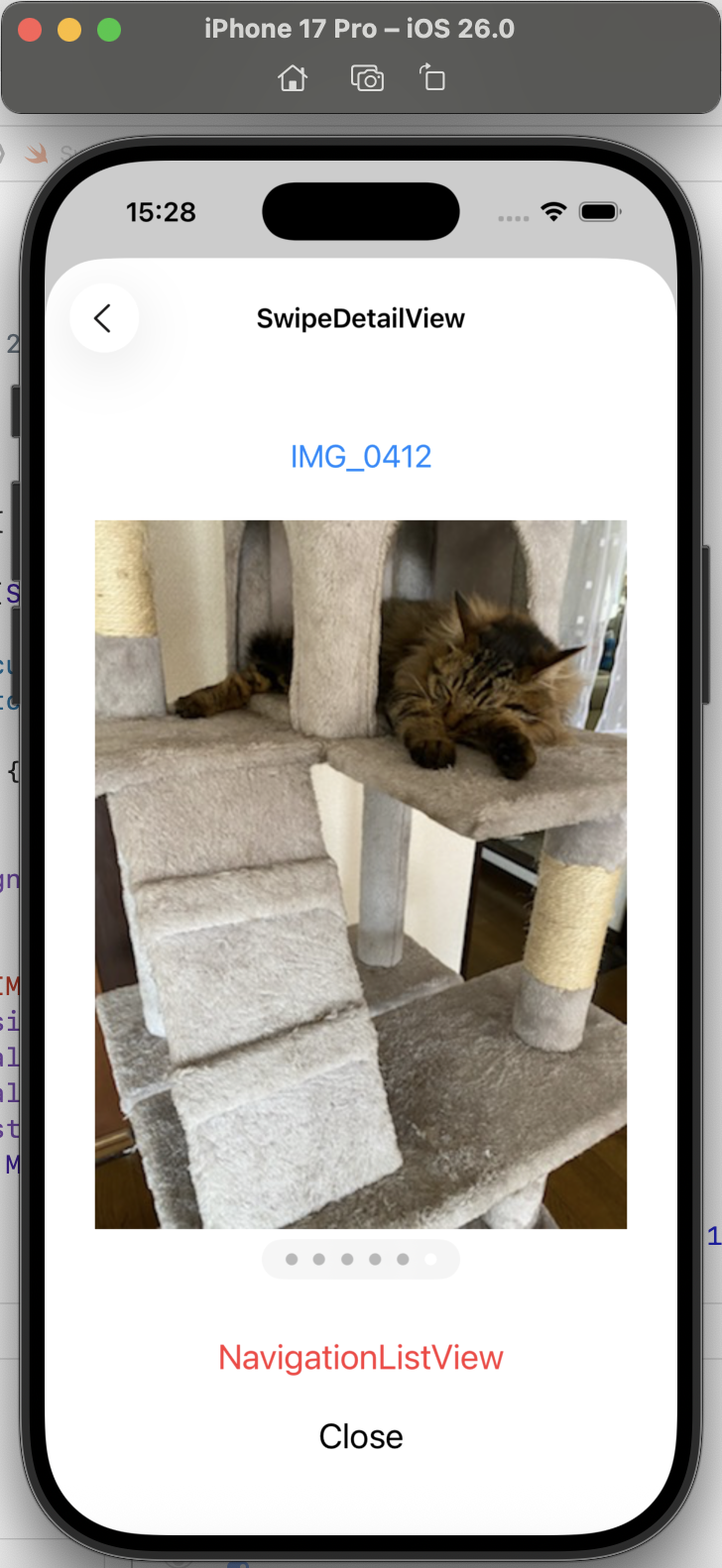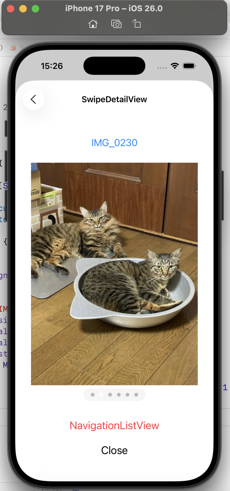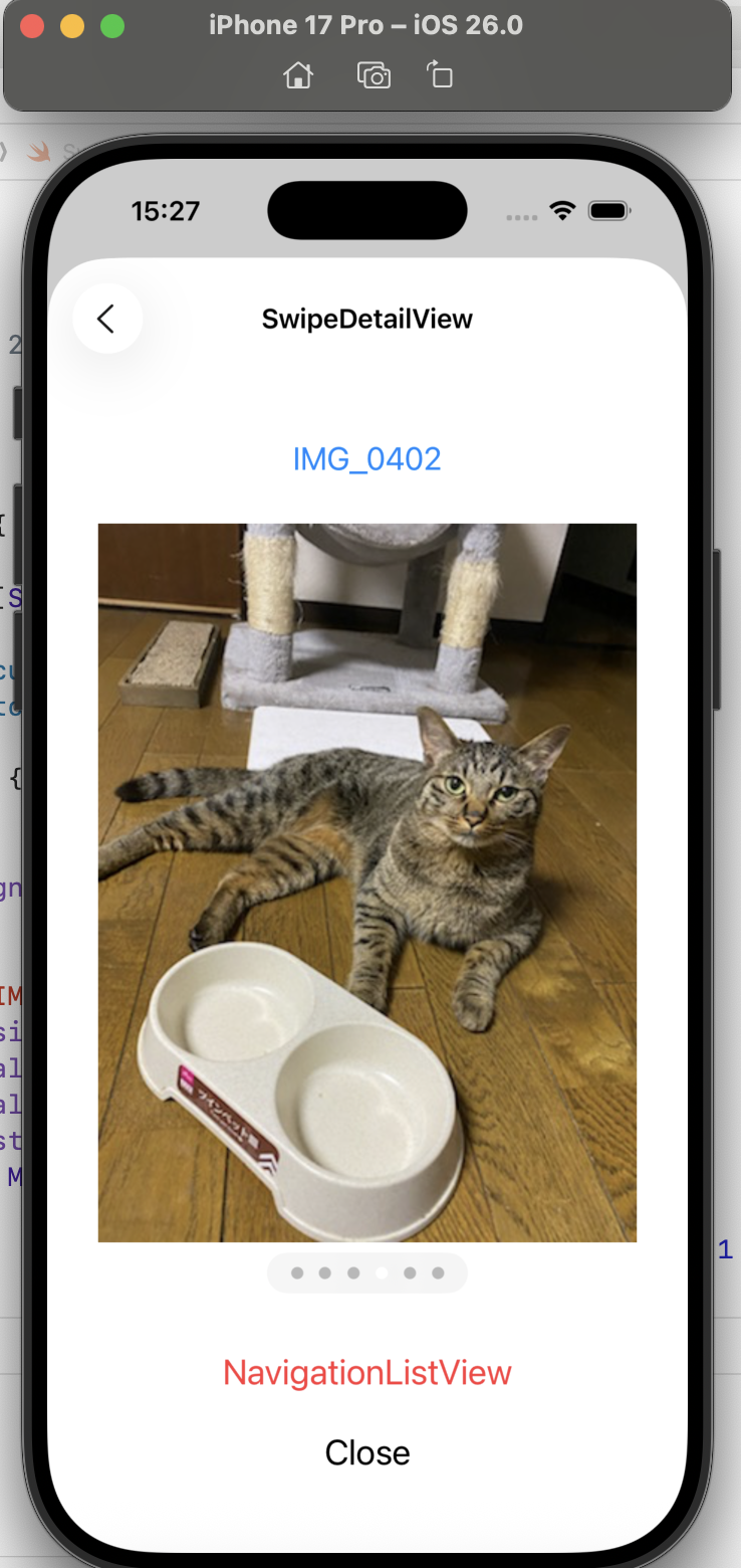 上記のように、SwipeDetailView へ画面推移した事が確認出来ると思います。