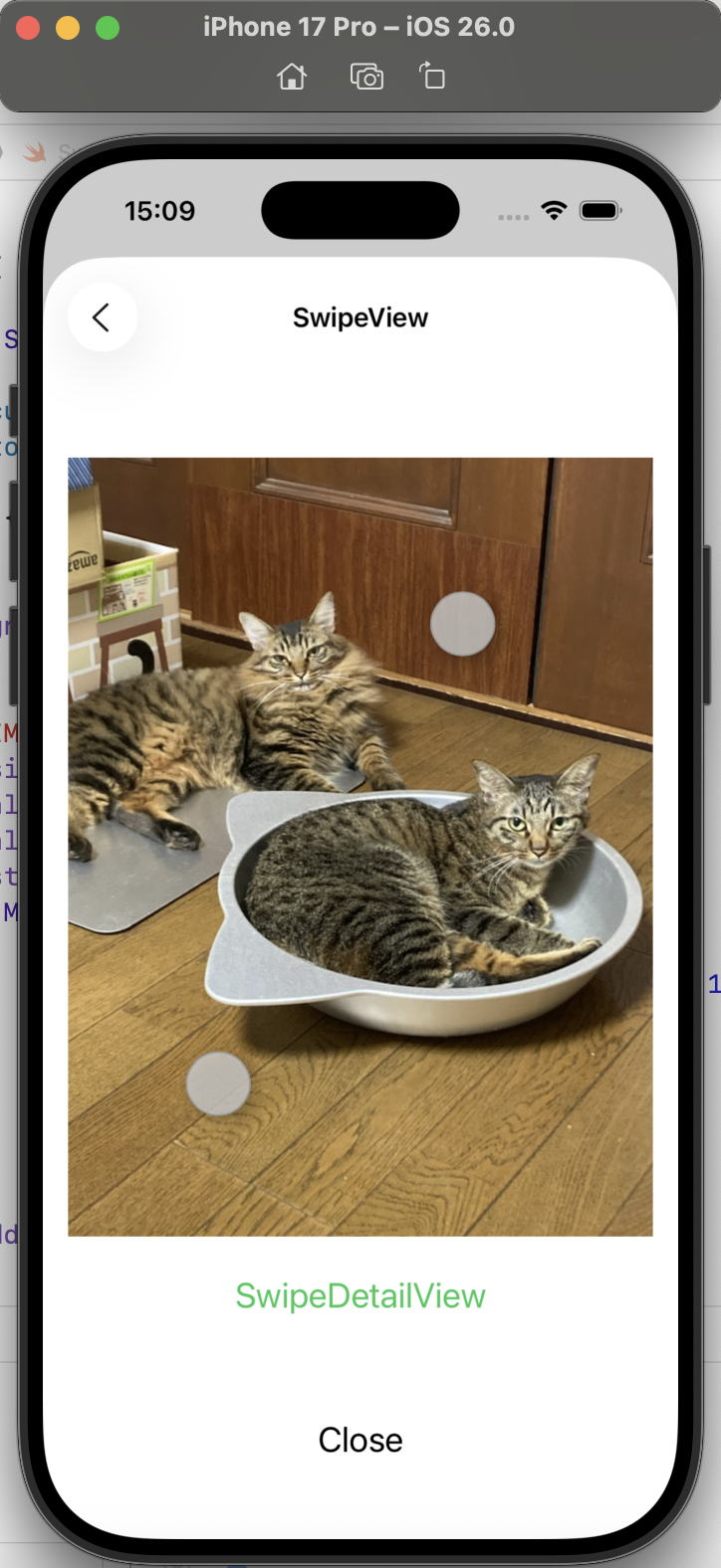 猫の画像の下には、SwipeDetailView のボタンが表示されています。