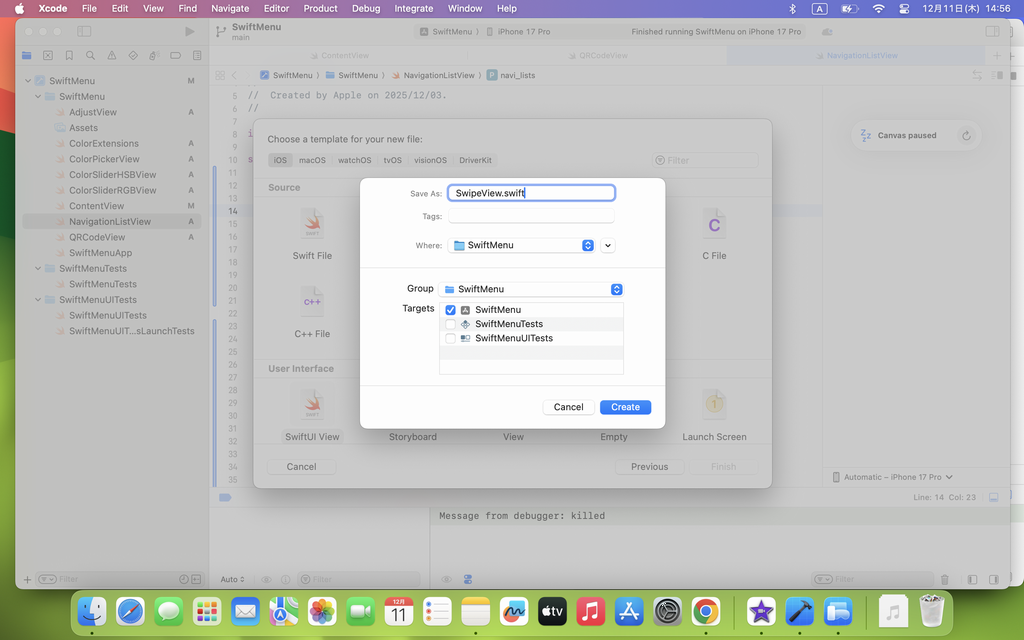 Create ボタンを押して、SwipeDetailView.swift を作成します。