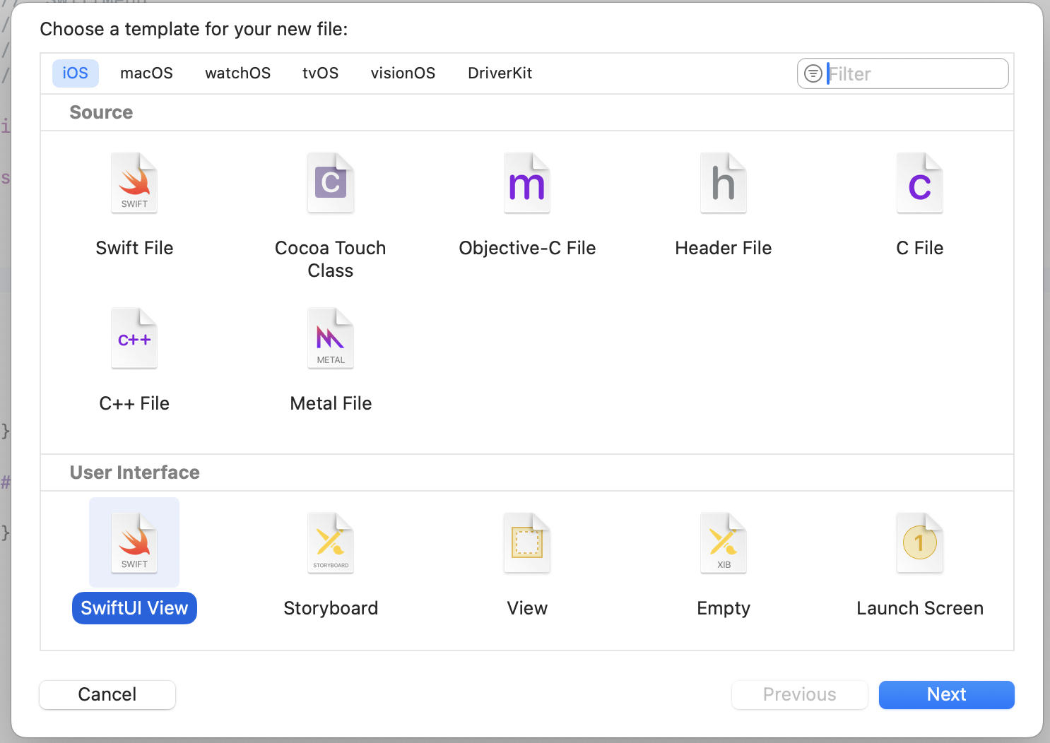 Xcode の上部タブメニューより、File → New → File from Template を選択します。