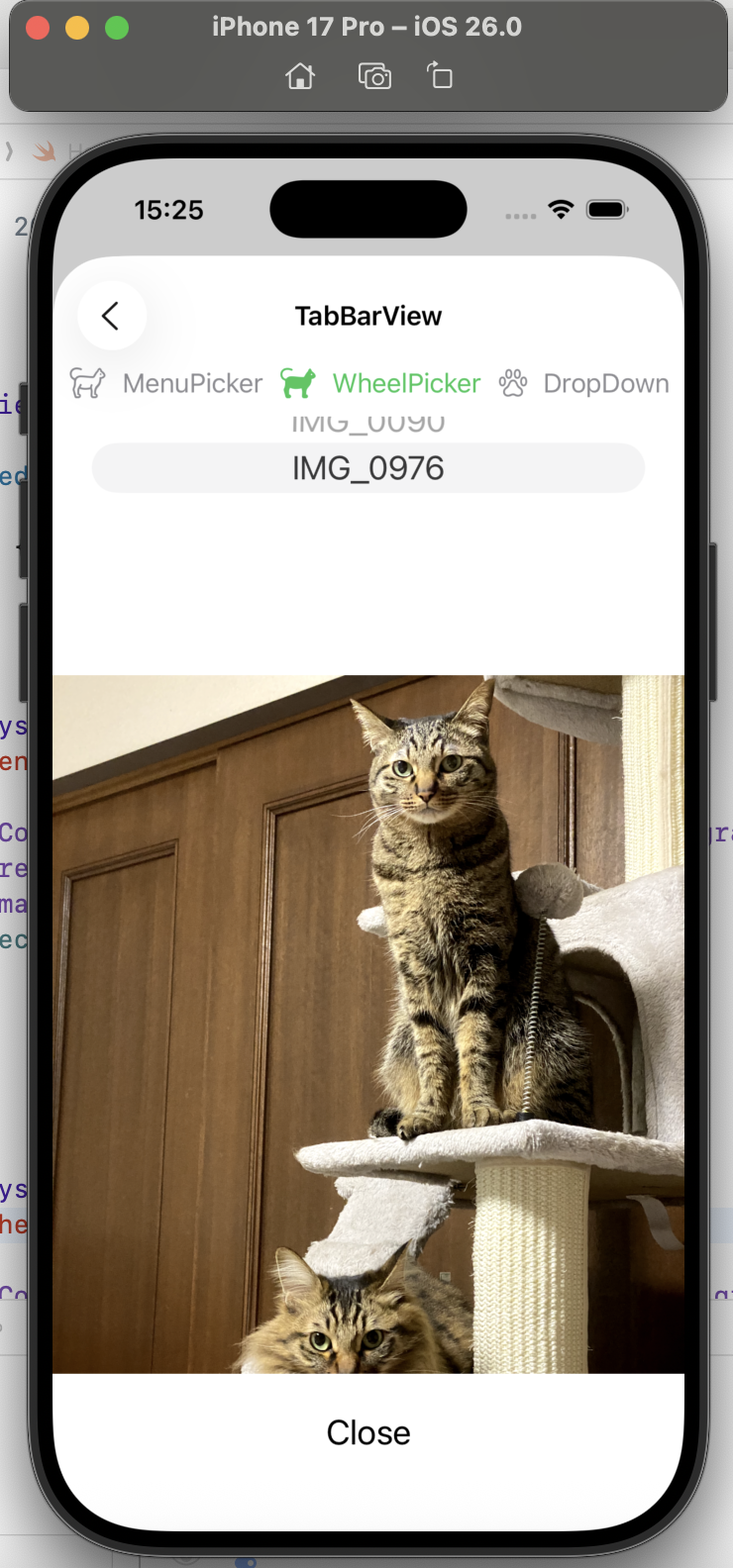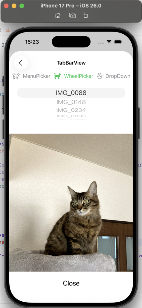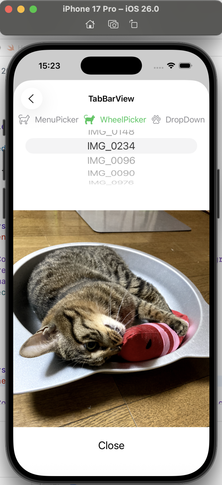- 上部Tabの中央には、グレー色で猫のアイコンと WheelPicker の文字が表示されています。