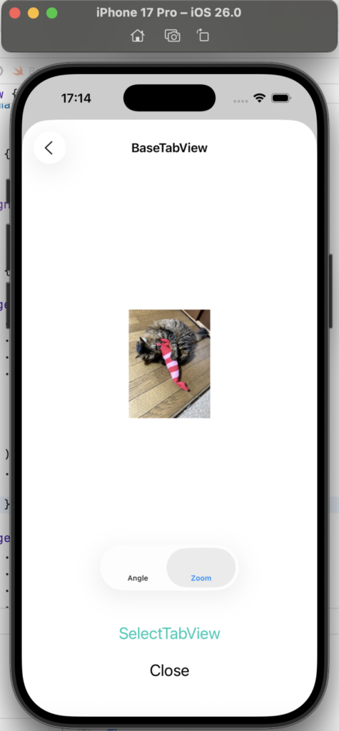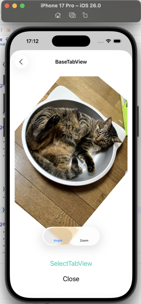BaseTabView では、猫の画像の任意の回転とトリプルタップによる縮小・拡大を確認しました。
