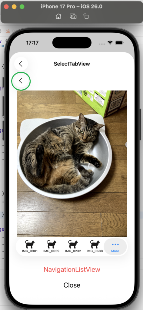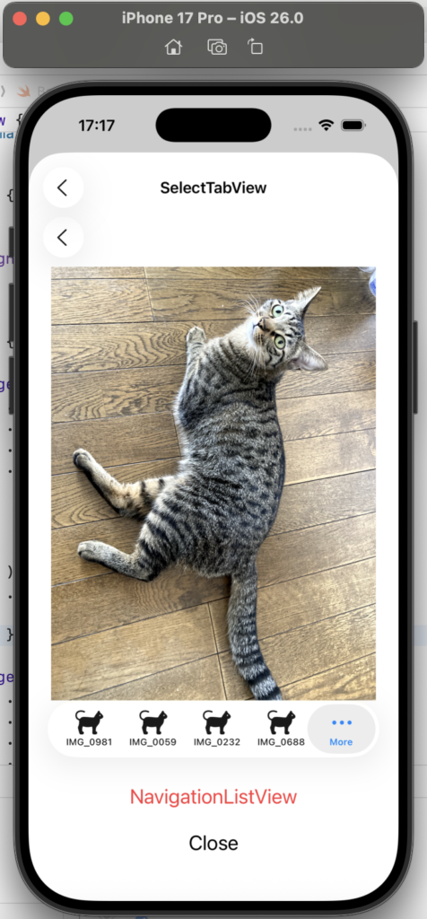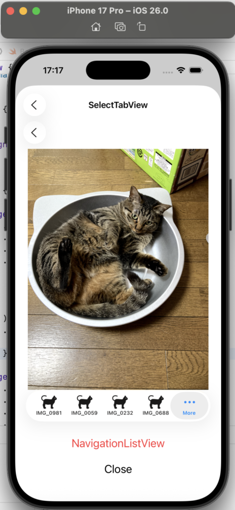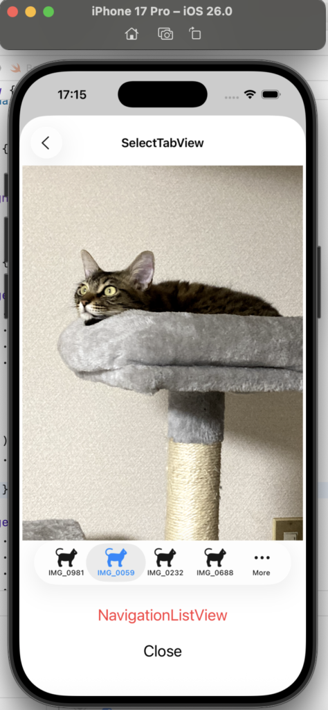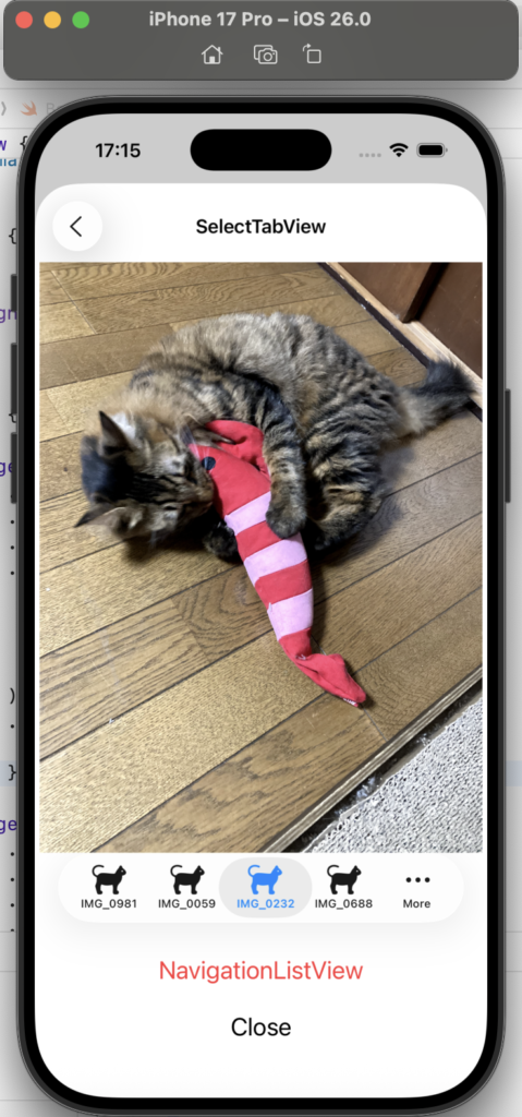 - .tabItem { Label(imageName, systemImage: “cat”) }:Tab 内に、画像(写真)の名称と、SF Symbols の猫のアイコンを設定しています。