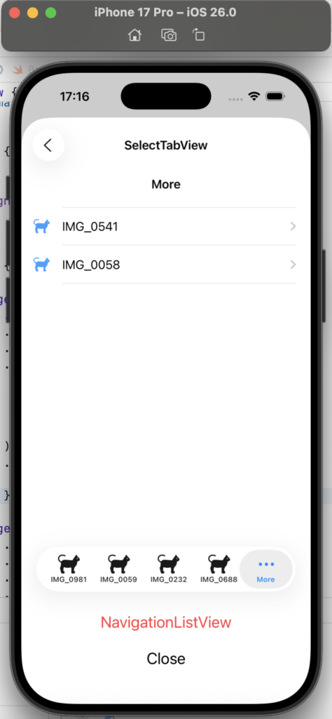 SelectTabView では、複数の Tab 表示とMoreリスト画面を確認しました。