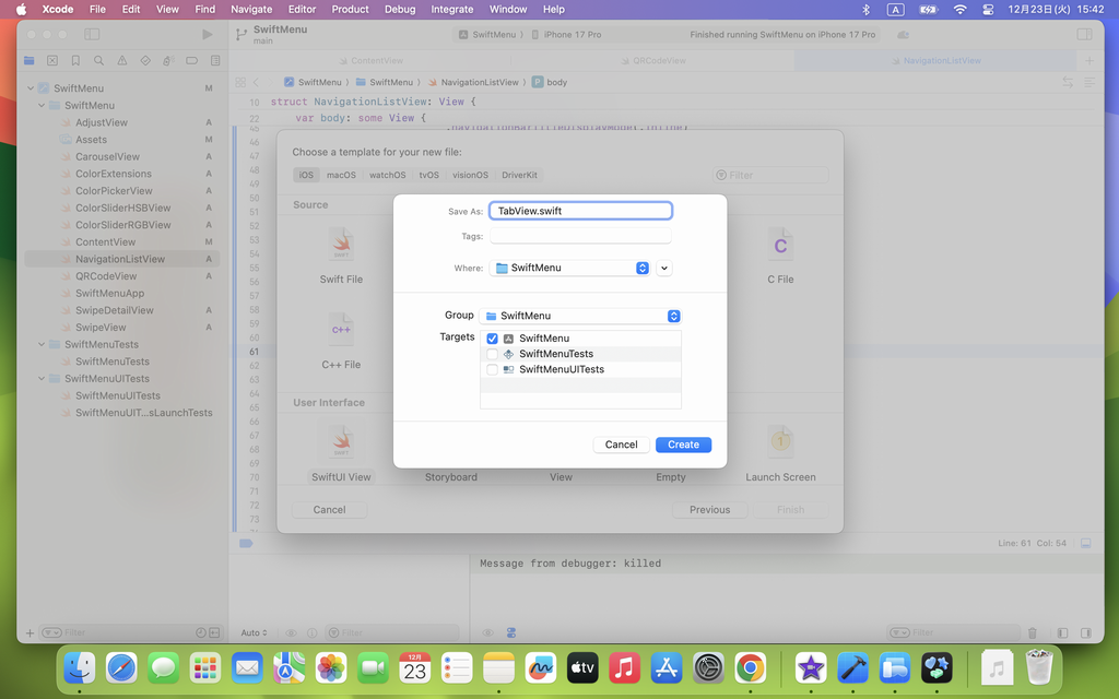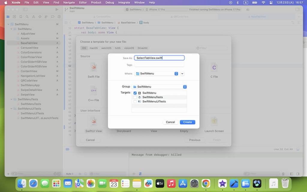 TabVeiw.swift と SelectTabVeiw を作成して処理の実装を進めて行きますが、今回、