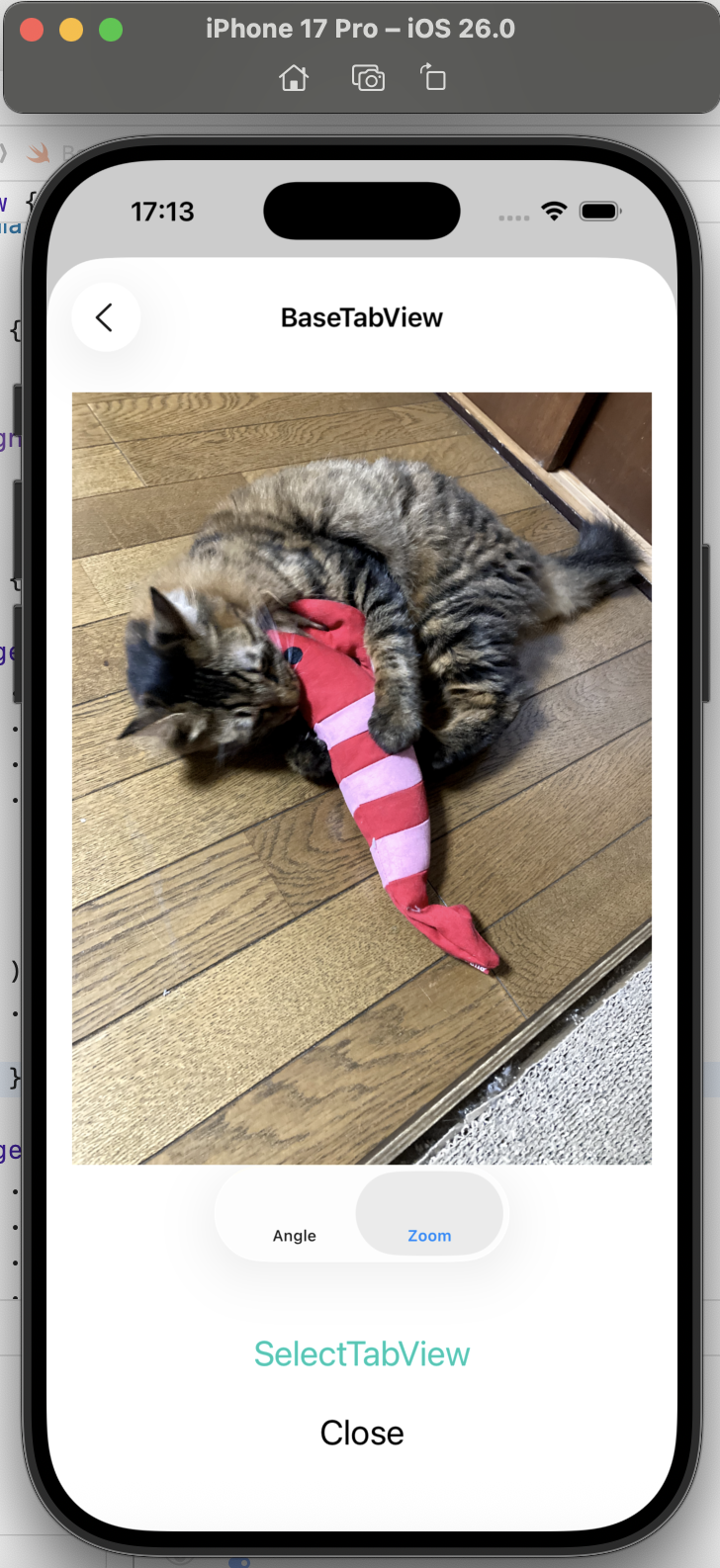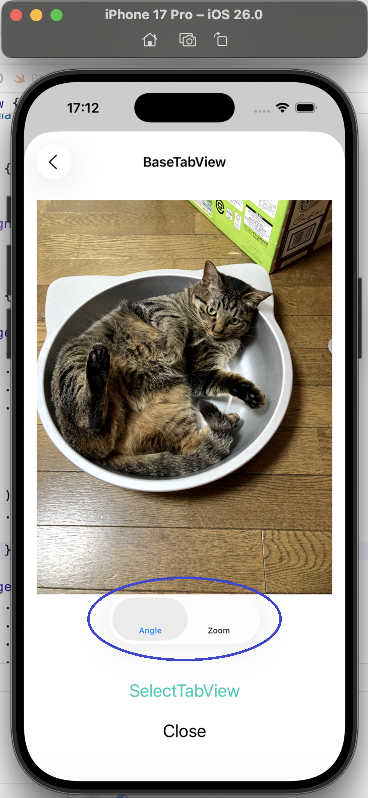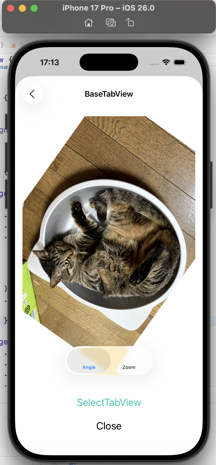BaseTabView では、猫の画像の任意の回転とトリプルタップによる縮小・拡大を確認しました。