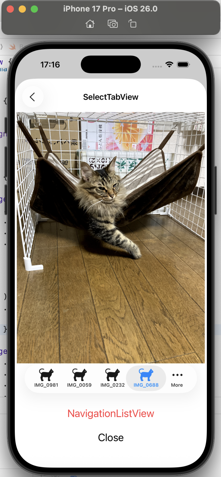 - .tabItem { Label(imageName, systemImage: “cat”) }:Tab 内に、画像(写真)の名称と、SF Symbols の猫のアイコンを設定しています。