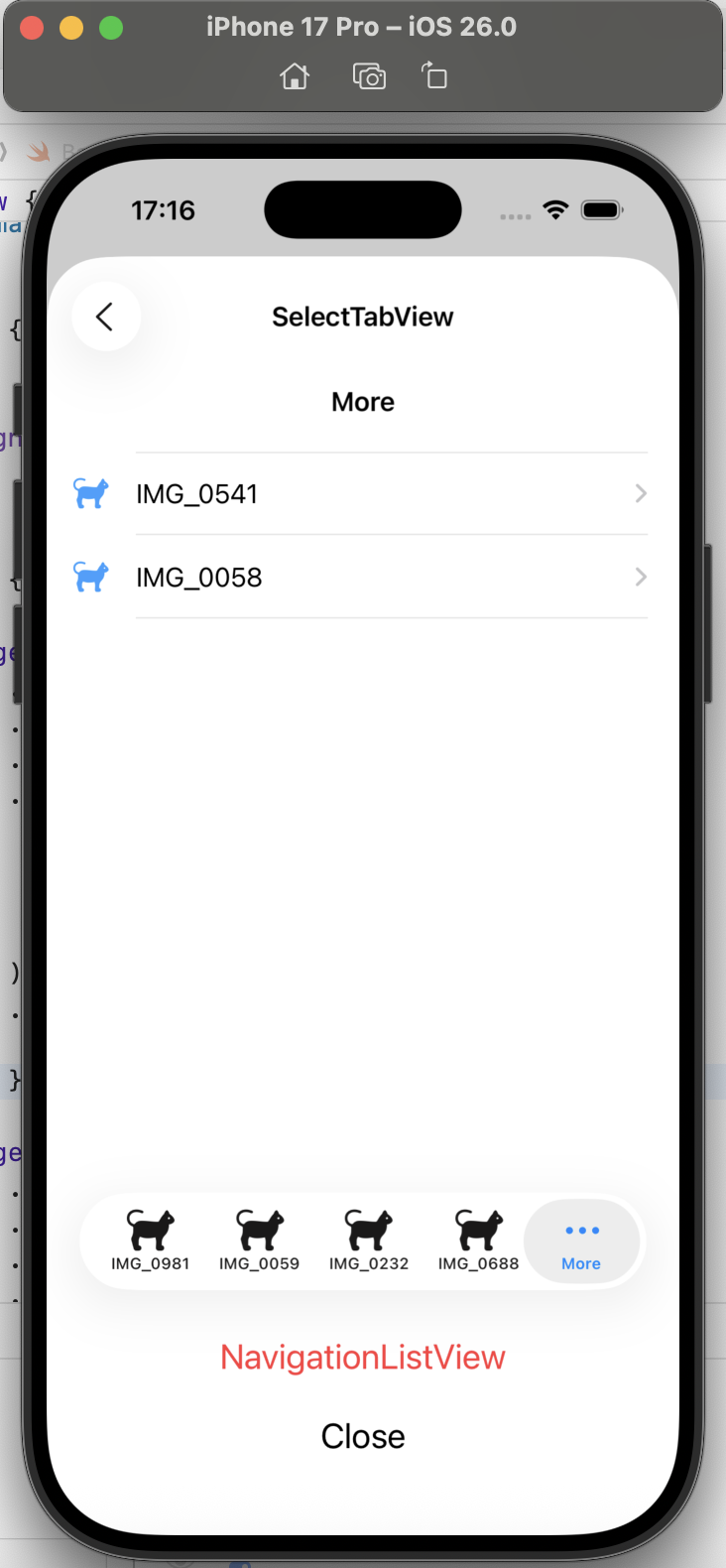 画面上部には、SelectTabView のタイトルの下に、More のサブタイトルが
