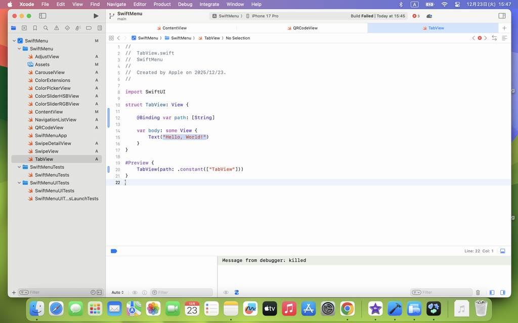 TabVeiw.swift を登録した途端に動かなくなり、色々と調査を行い、Xcode の変更や