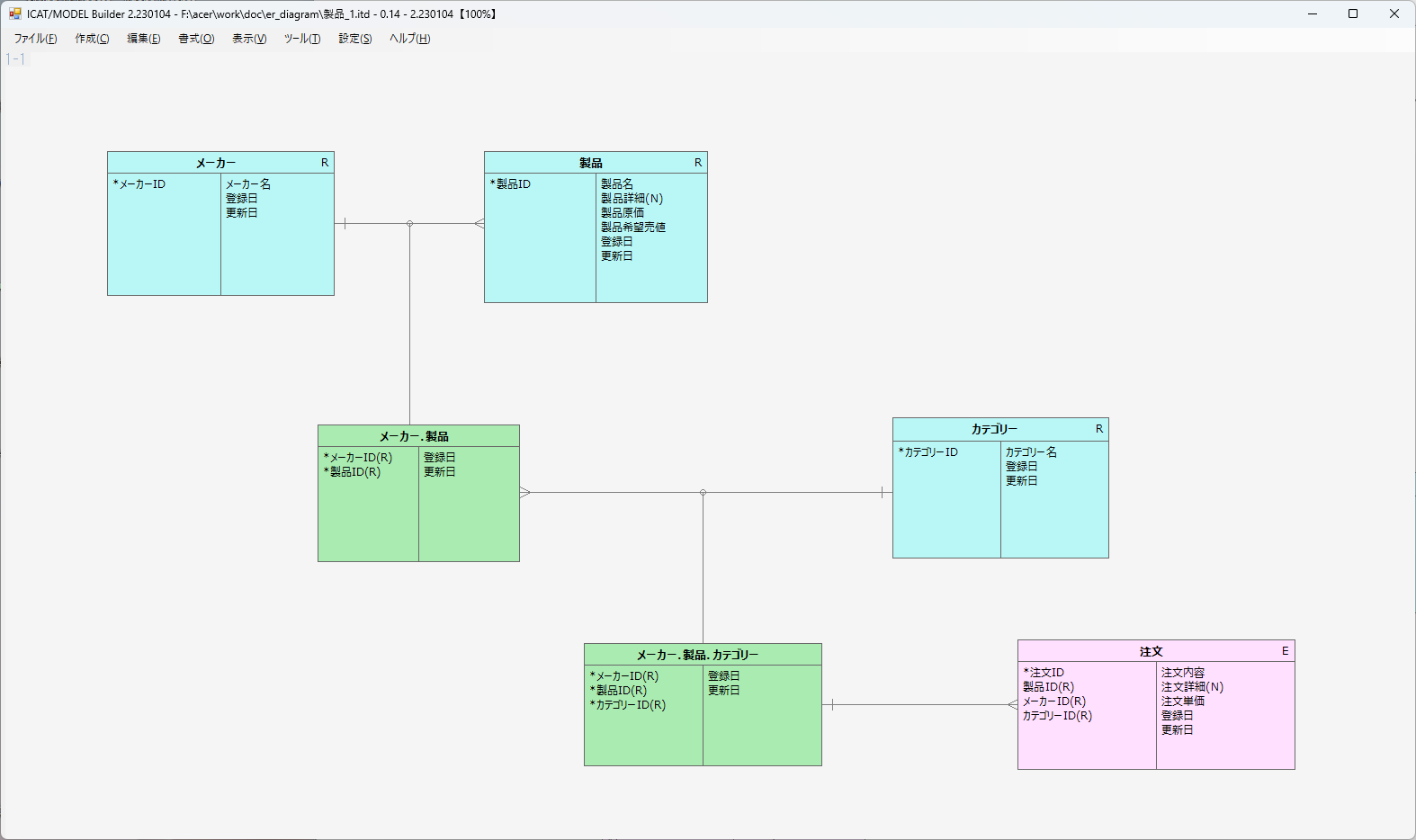 「メーカー.製品.カテゴリー(対照表):注文(イベント)=1:複数(m)」の関係